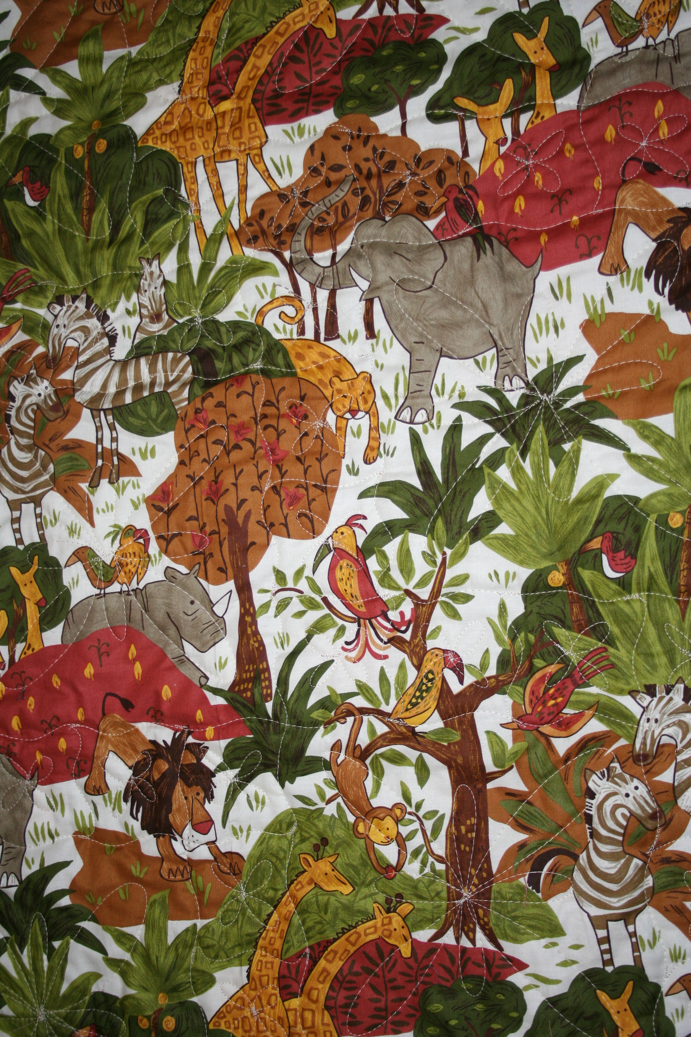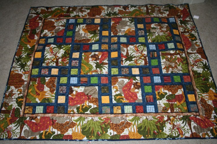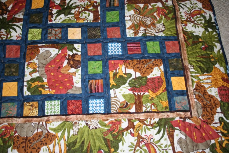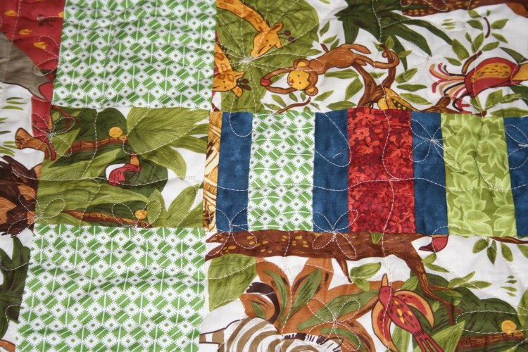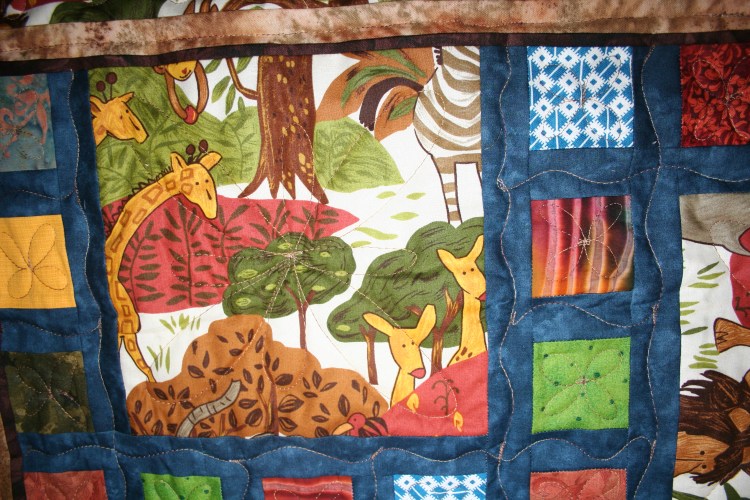 When I was piecing the top I didn’t think of the fact that the Jungle print is directional, so the animals are going in all directions. But it worked out just fine. You can see some of the quilting in this photo. I used the King Tut thread again and again it worked perfectly. It will definitely be the thread of choice from now on.