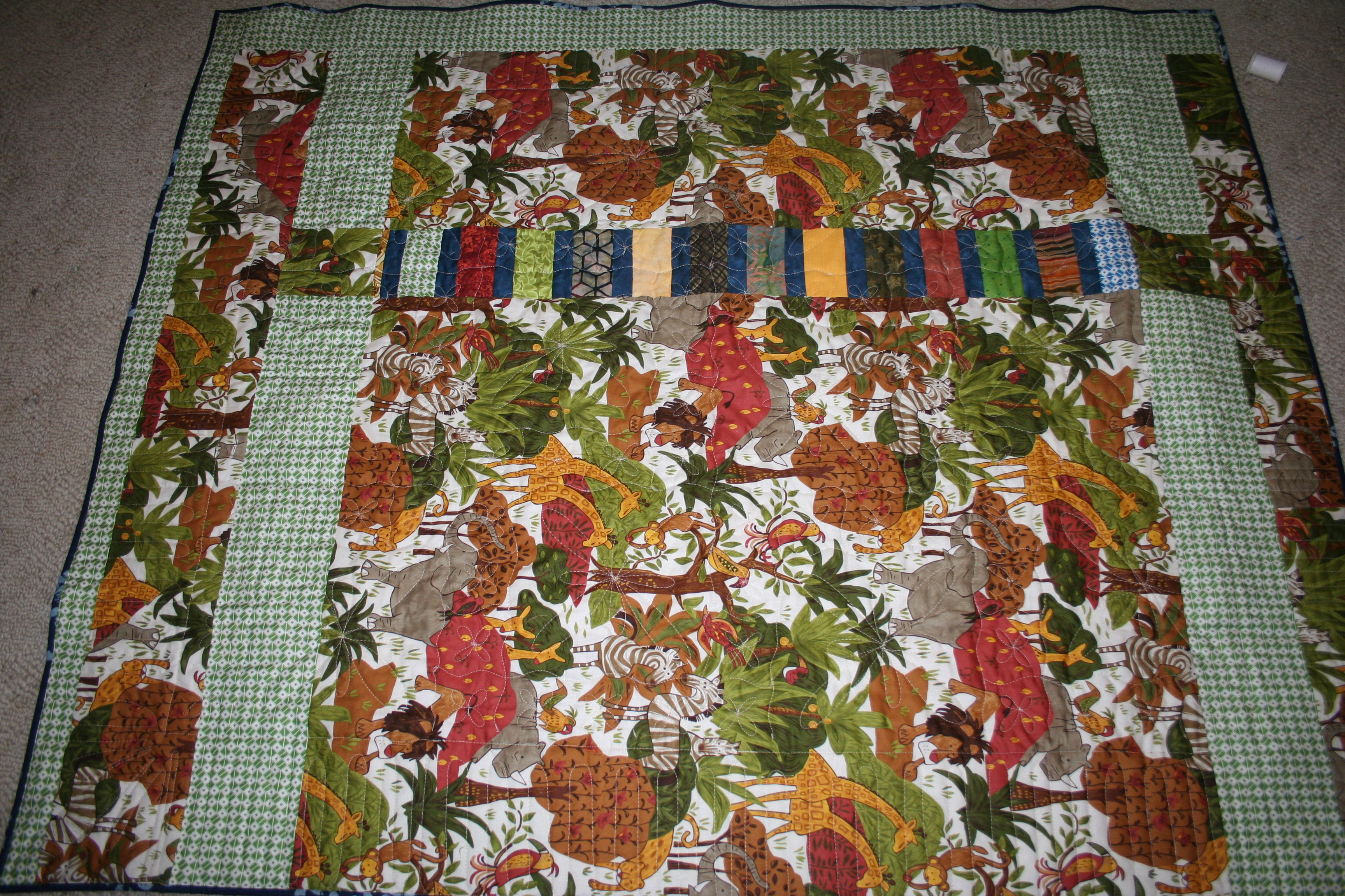 I pieced the back on this one also. I had leftover stripes from the front and the green fabric from some other quilt. The combination of those and the Jungle print worked out pretty good. Unfortunately I didn’t make sure that the back wasn’t big enough for the front. So when I got to the last 6 inches of quilting I had to take the whole quilt off, sew on a 2 inch strip (the green strip on the left) and put the quilt back on the machine to finish the quilting. It was fun. 🙂