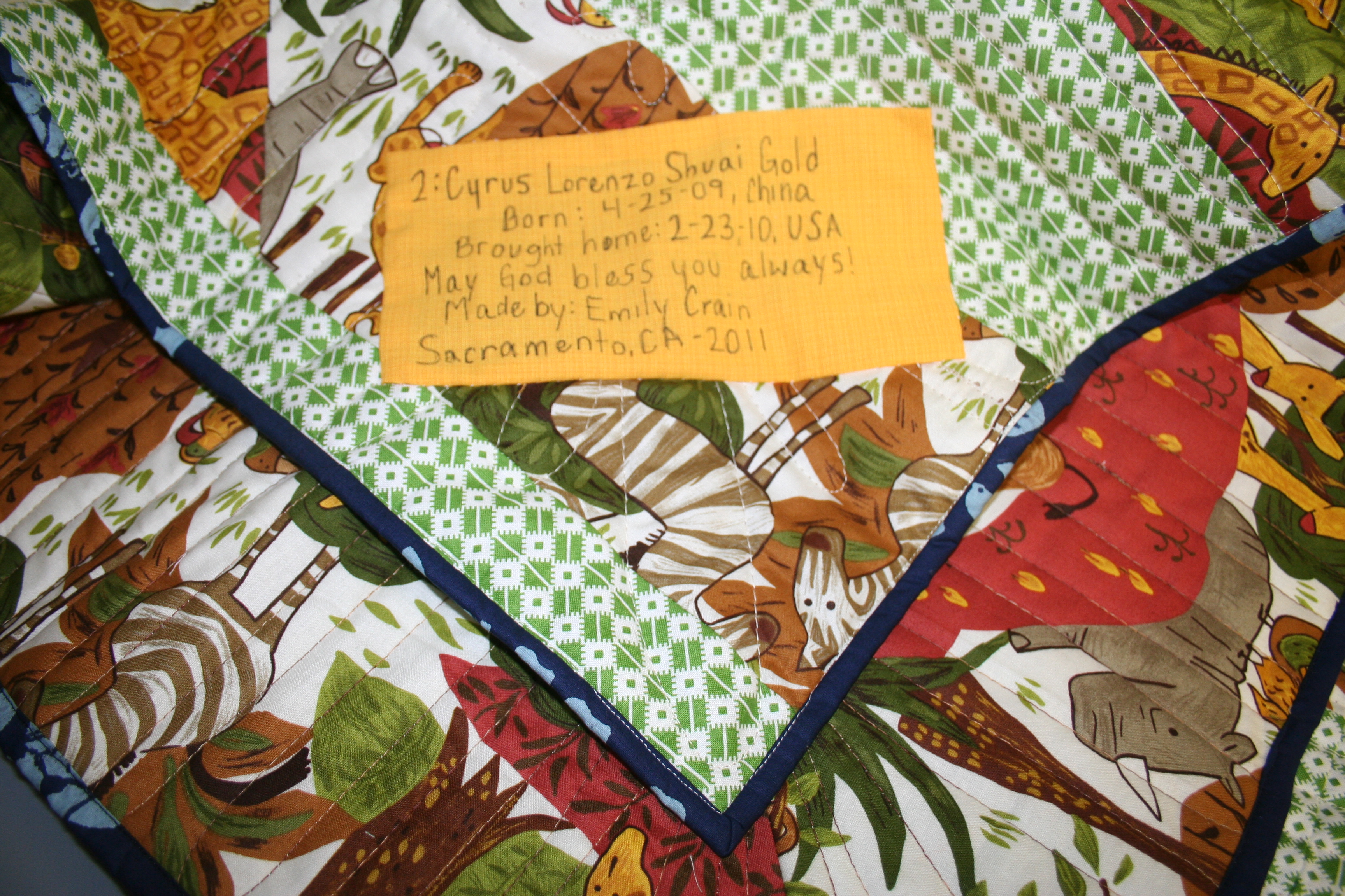 A year ago a precious baby boy from China came home to a friend of mine. I finished his quilt this week.