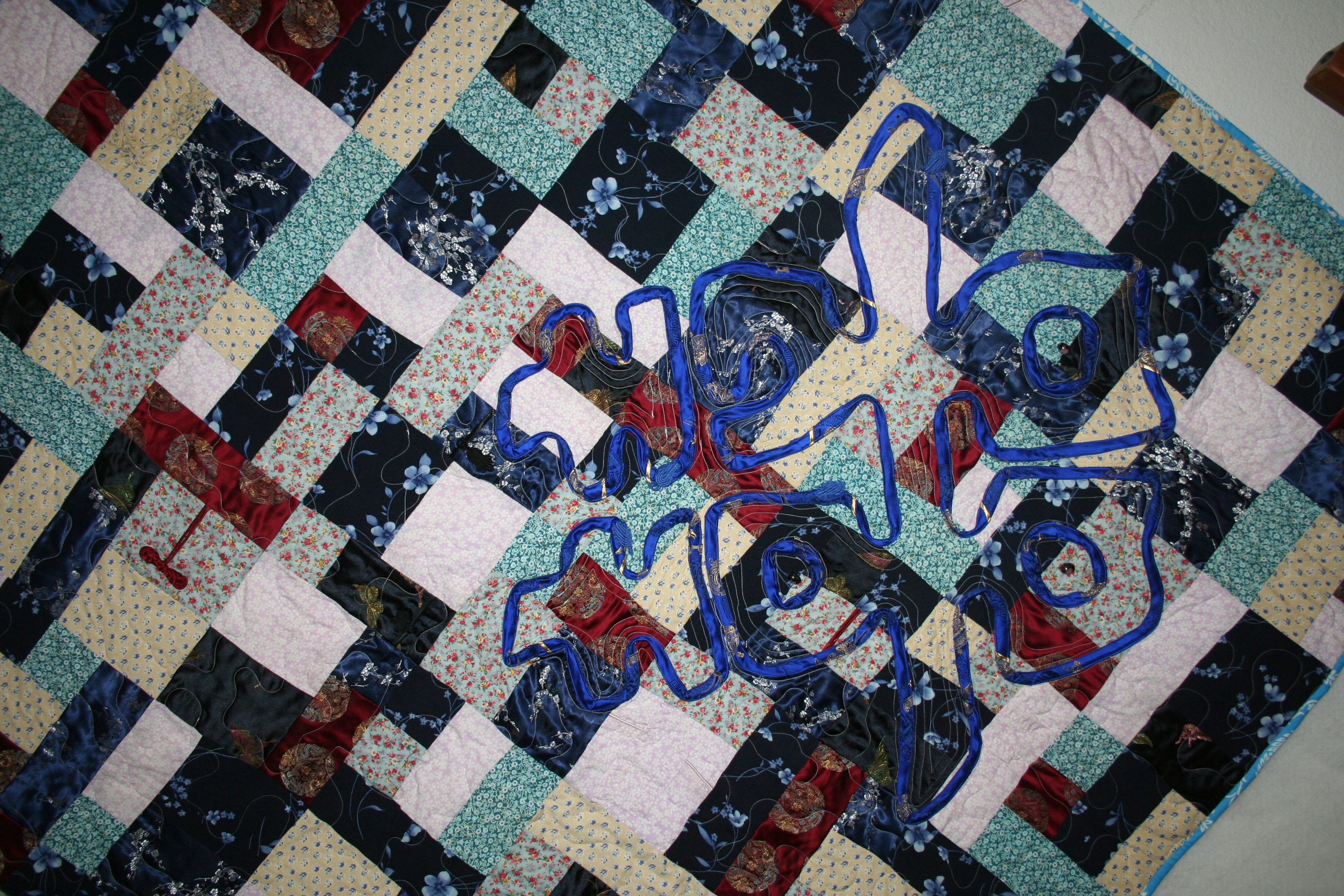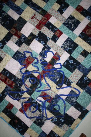 If the kids get one, then so does Mom. This quilt has an applique of the Double Happiness Chinese Symbol. It was made from clothes worn while she was in the Peace Core in China.
