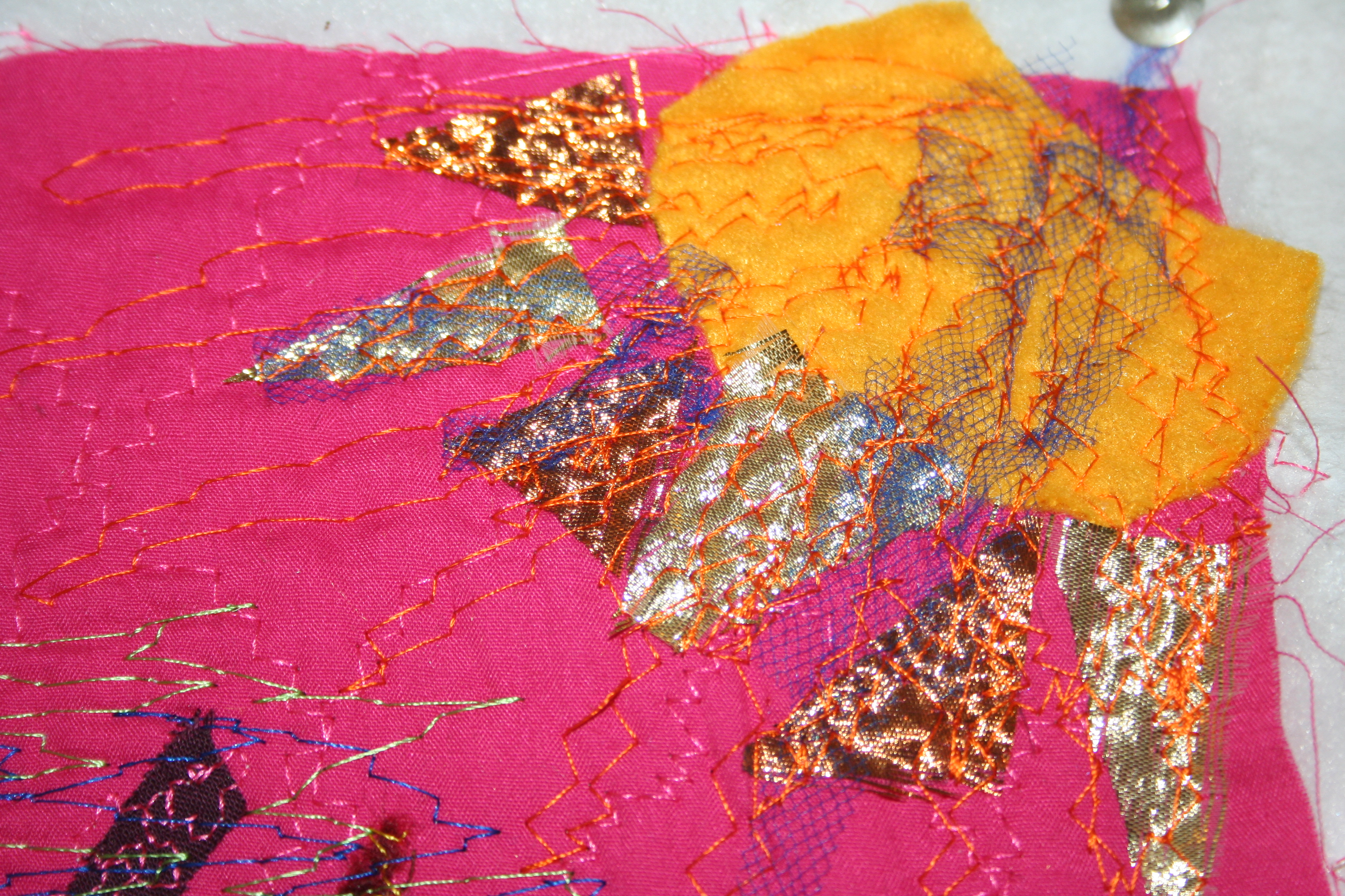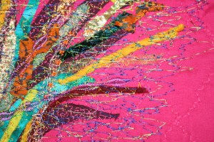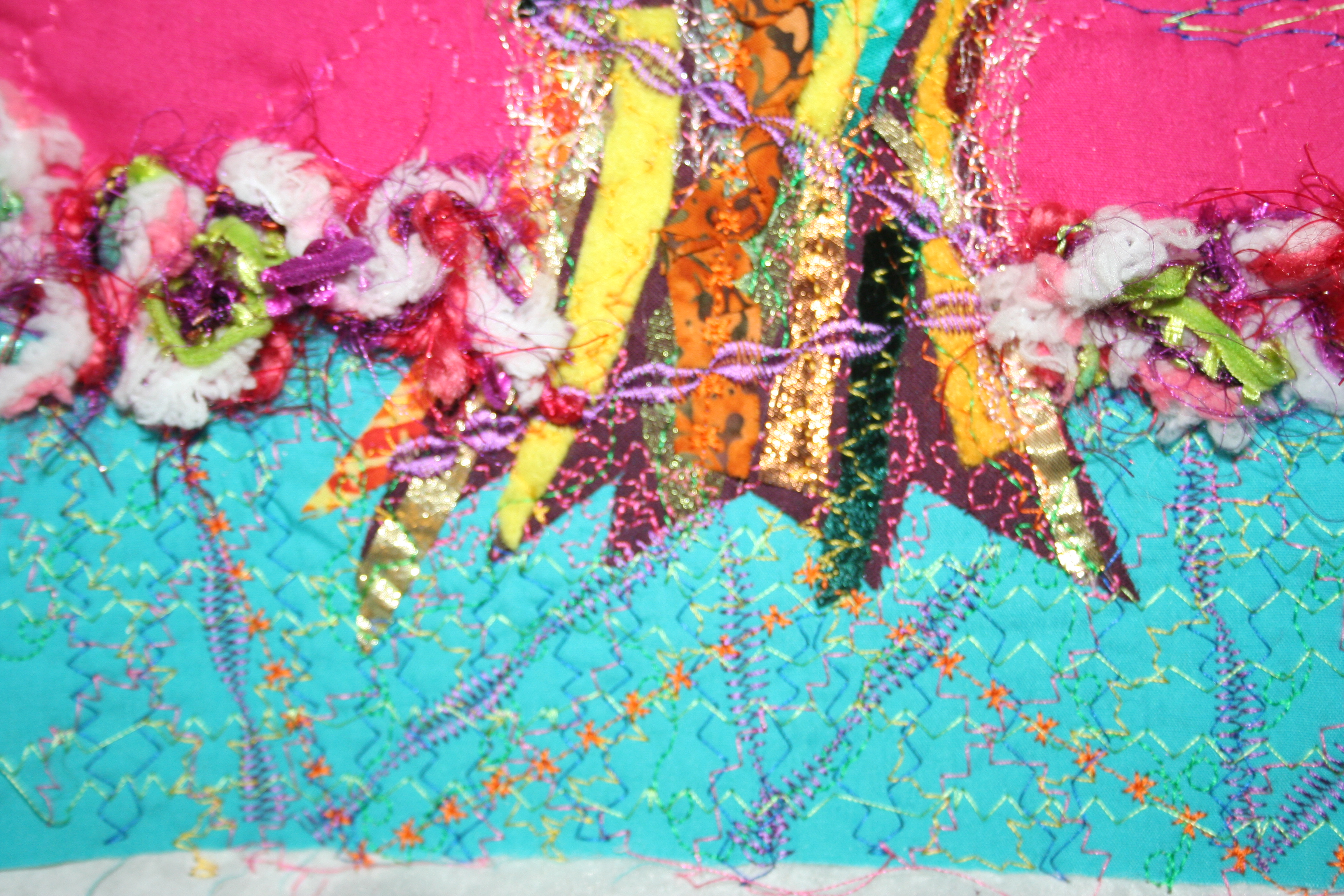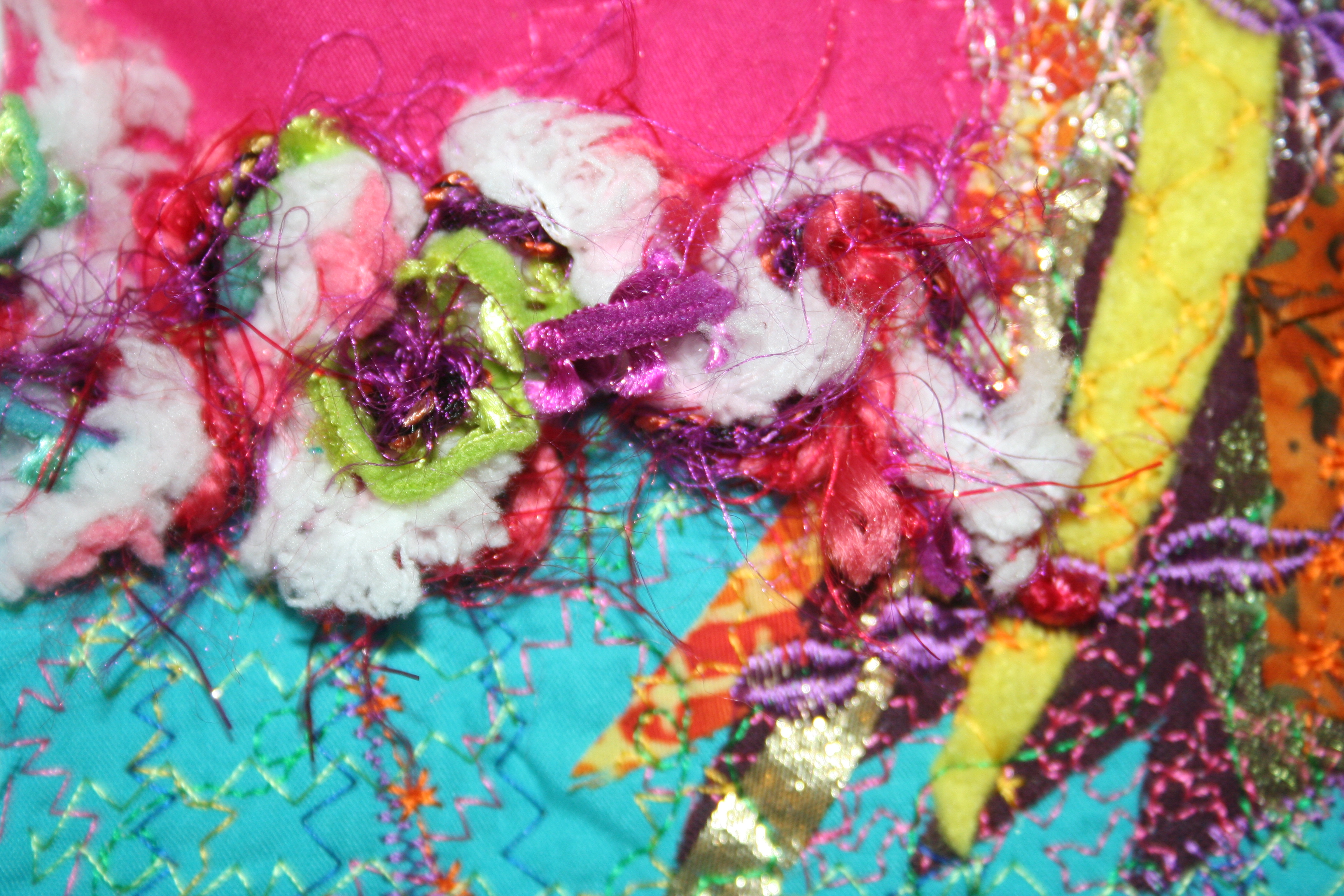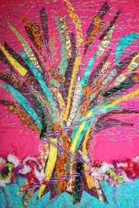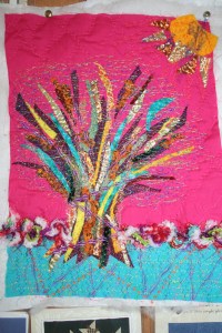 There were several steps to create the foundation and then build your tree from that. Each one turned out so different. It was neat to see them all. Here is mine.Details of the tree – it began as a dark maroon color.And a close up of the leaves…yes some are blue.And then there are the roots. and ground.An interesting twisted/gathered yarn technique…but I forgot to twist, so mine is just gathered.And being the over achiever that I am…I added a sun.It was a fun class. Interesting techniques. But they take forever…