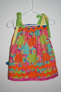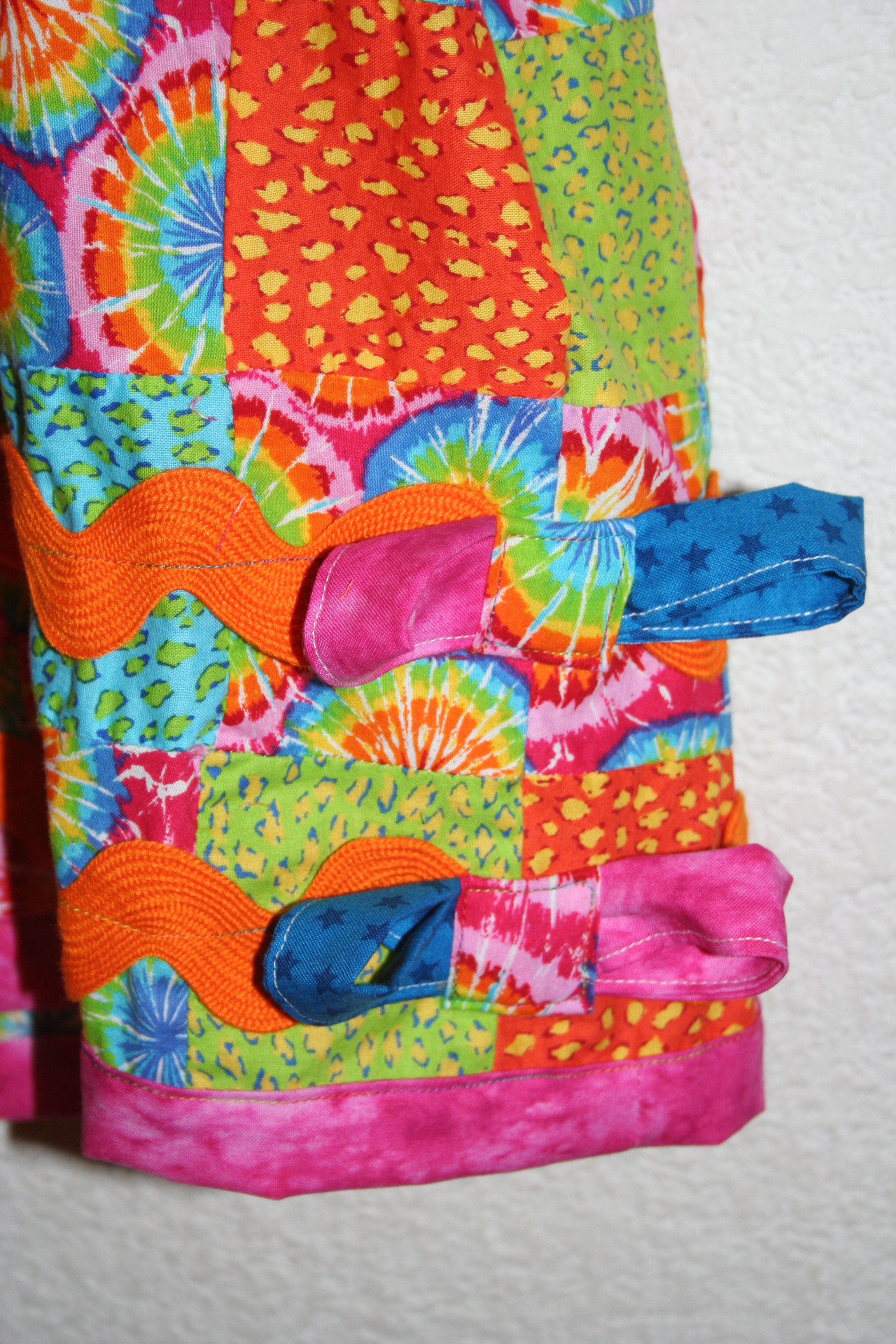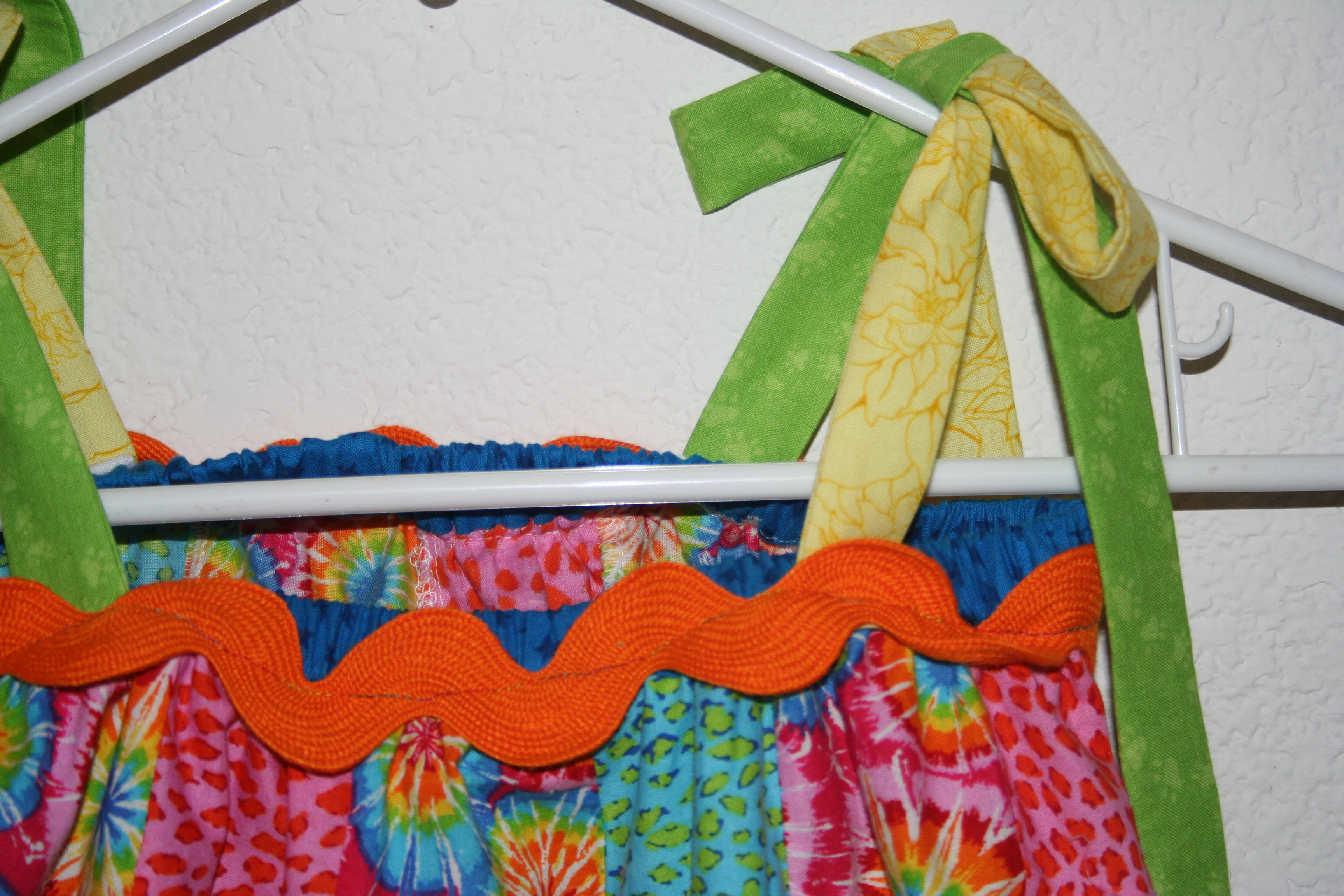 With large orange ric-rac and blue at the top with yellow and green ties…