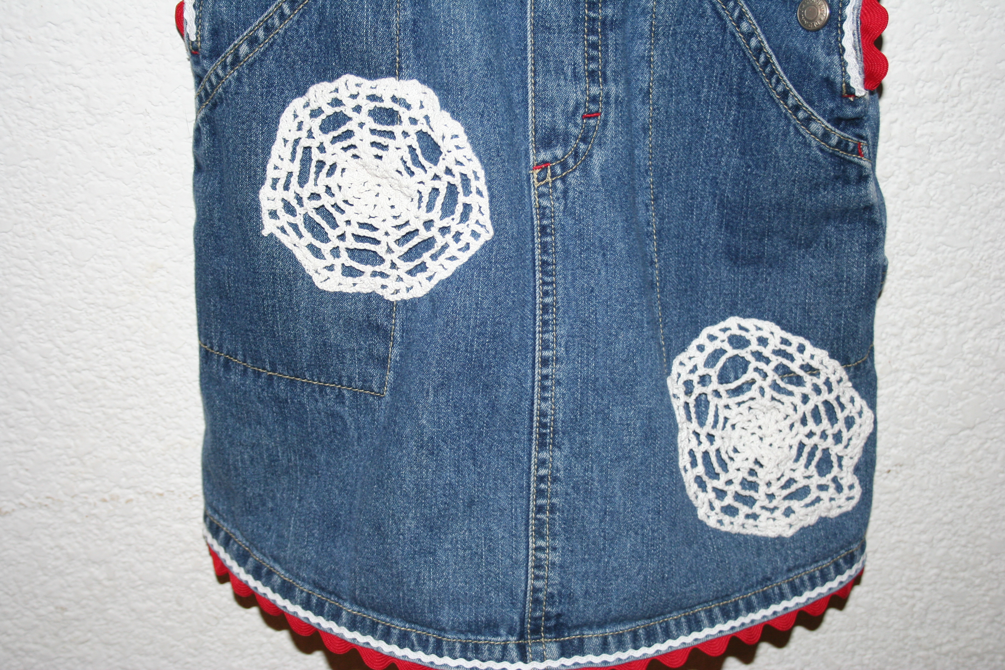 I added big red and little white ric-rac and snowflakes (also found at the thrift store).