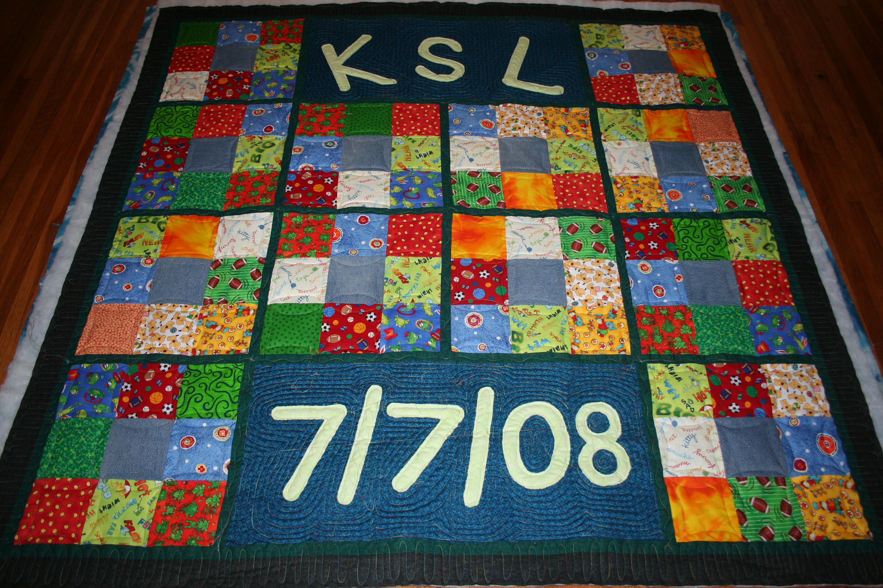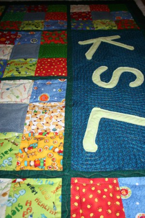 I quilted this one with rounded seams in the 9-patch and echo quilting around the initials and date.