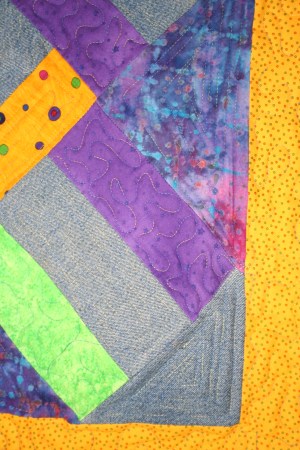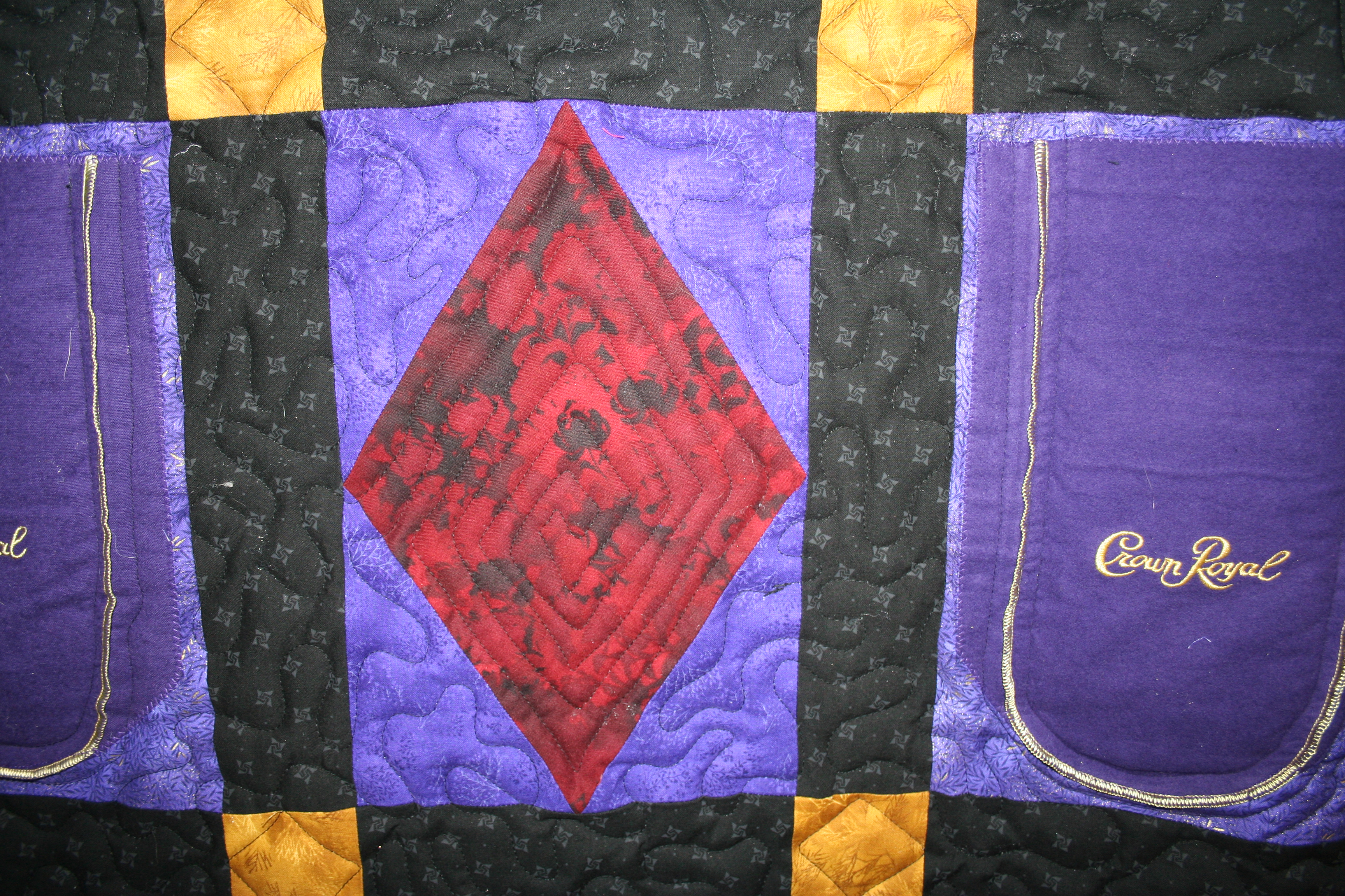 Her other son likes Crown Royale. He collected bags and insisted on using them on a quilt. As for quilting, the bags are outlined inside and out, a spiral in the diamonds and meander through out the rest.
