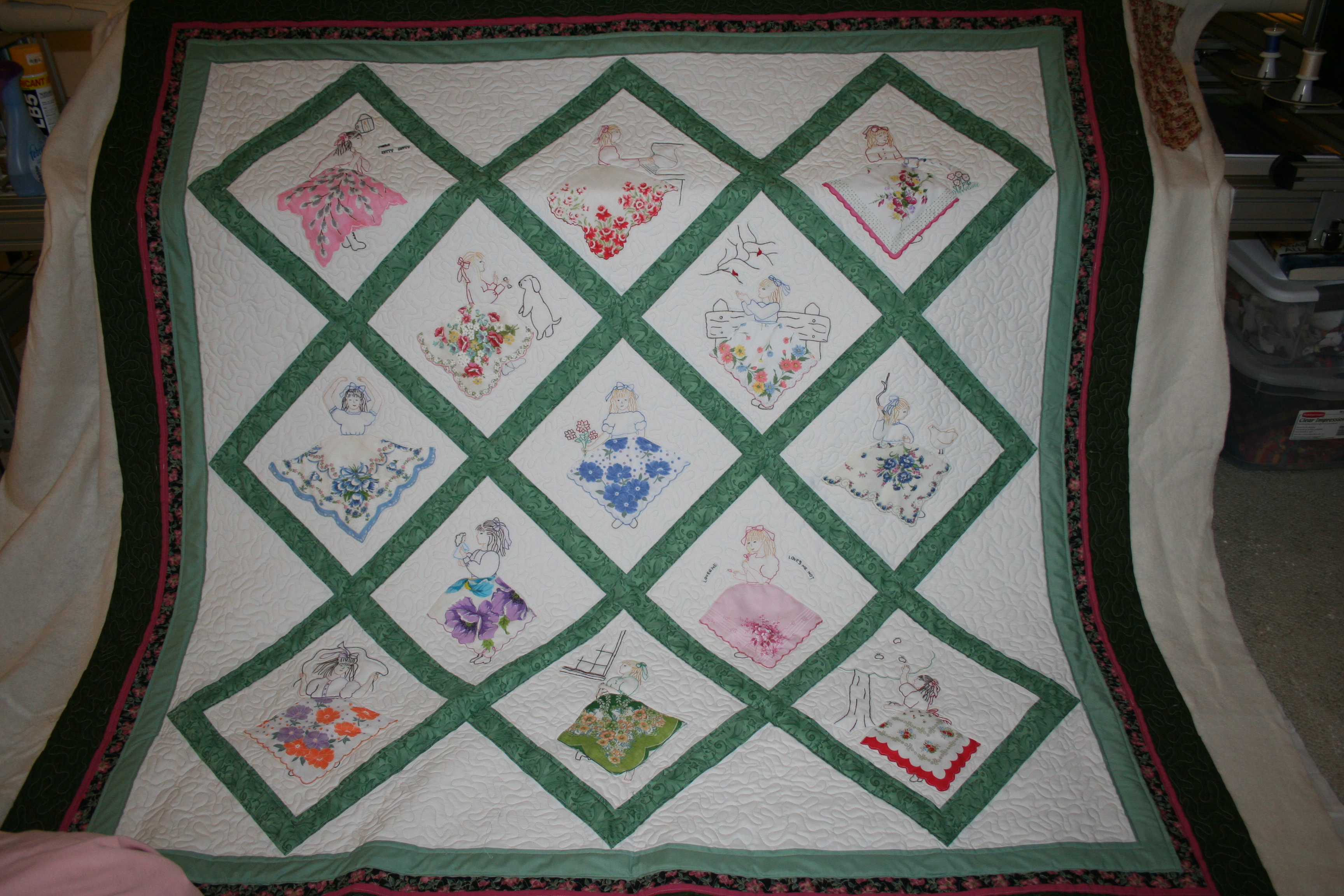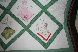 For another return customer that deals with antiques, I quilted a quilt with antique hankies made in to the skirts of society girls. The girls are outlined and an all over meander is through out the white background and outside border. Other borders and sashing have a ¼ outline.