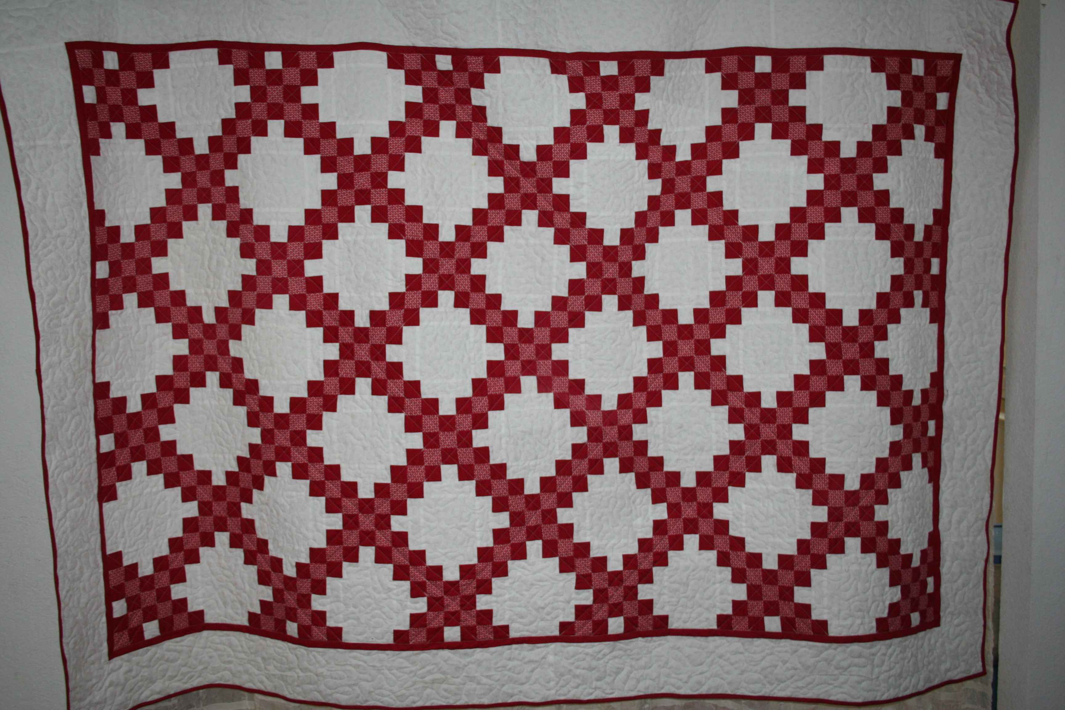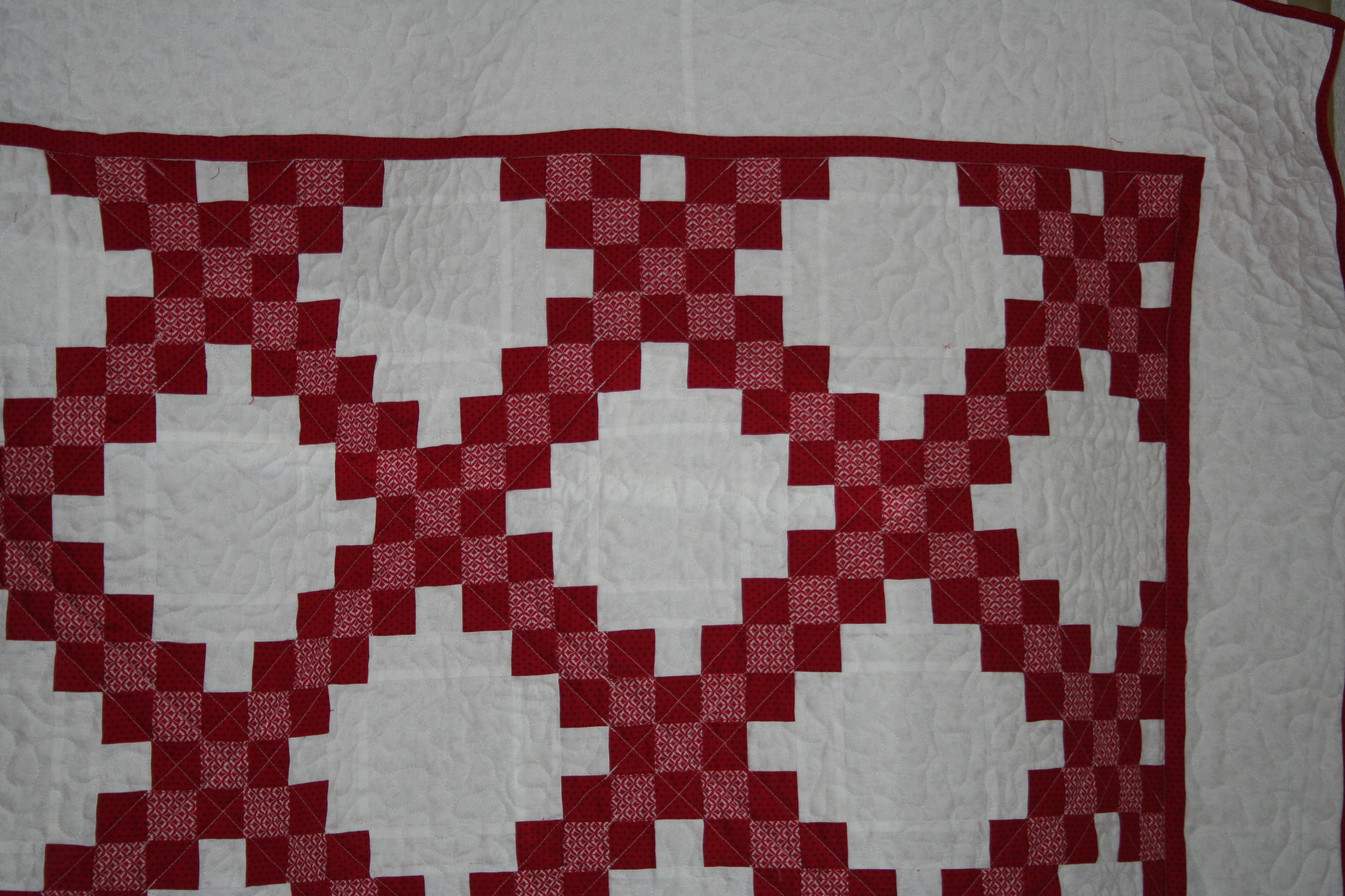 This quilt has straight lines through the 3 chains and red border and an all over meander in the white back ground.