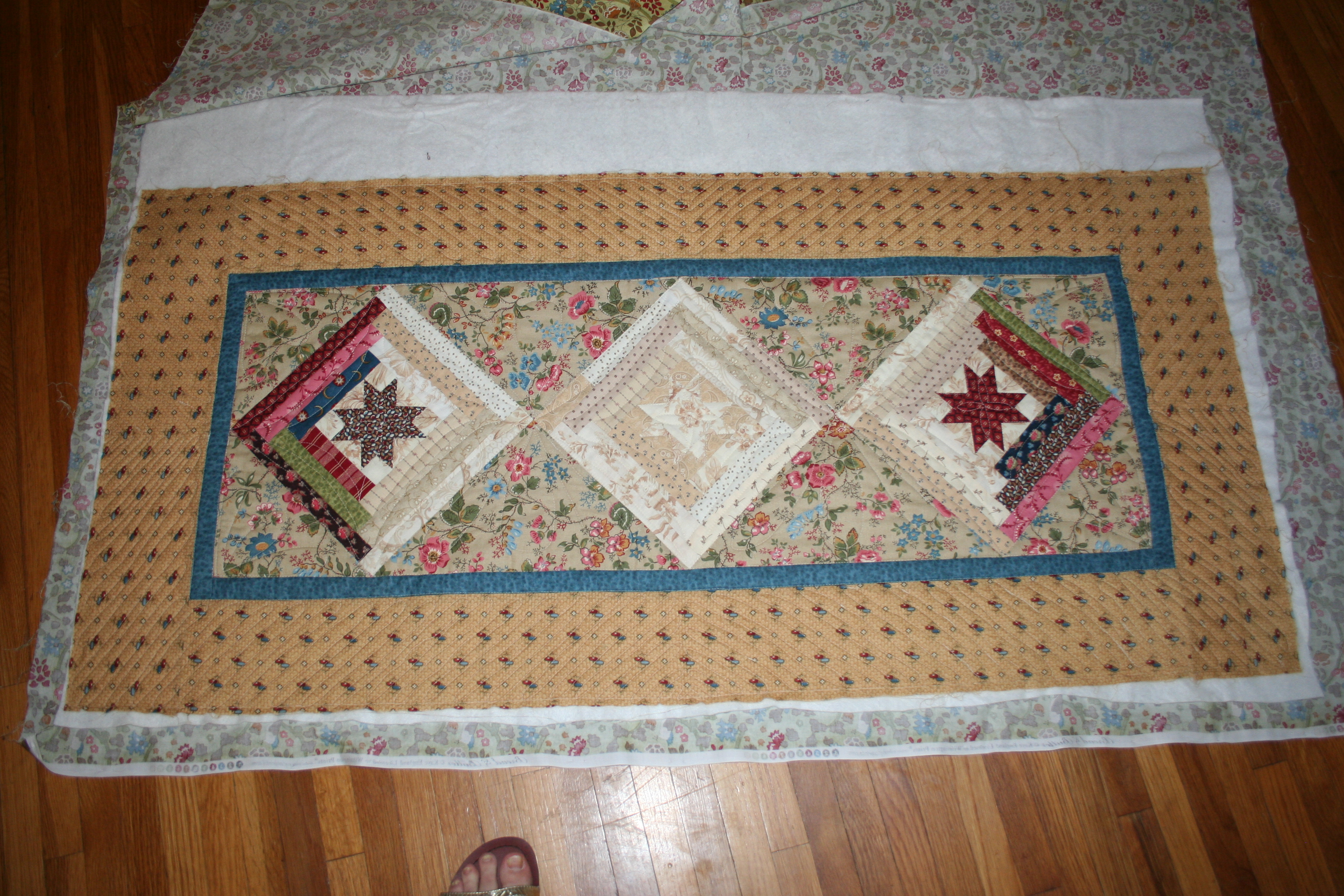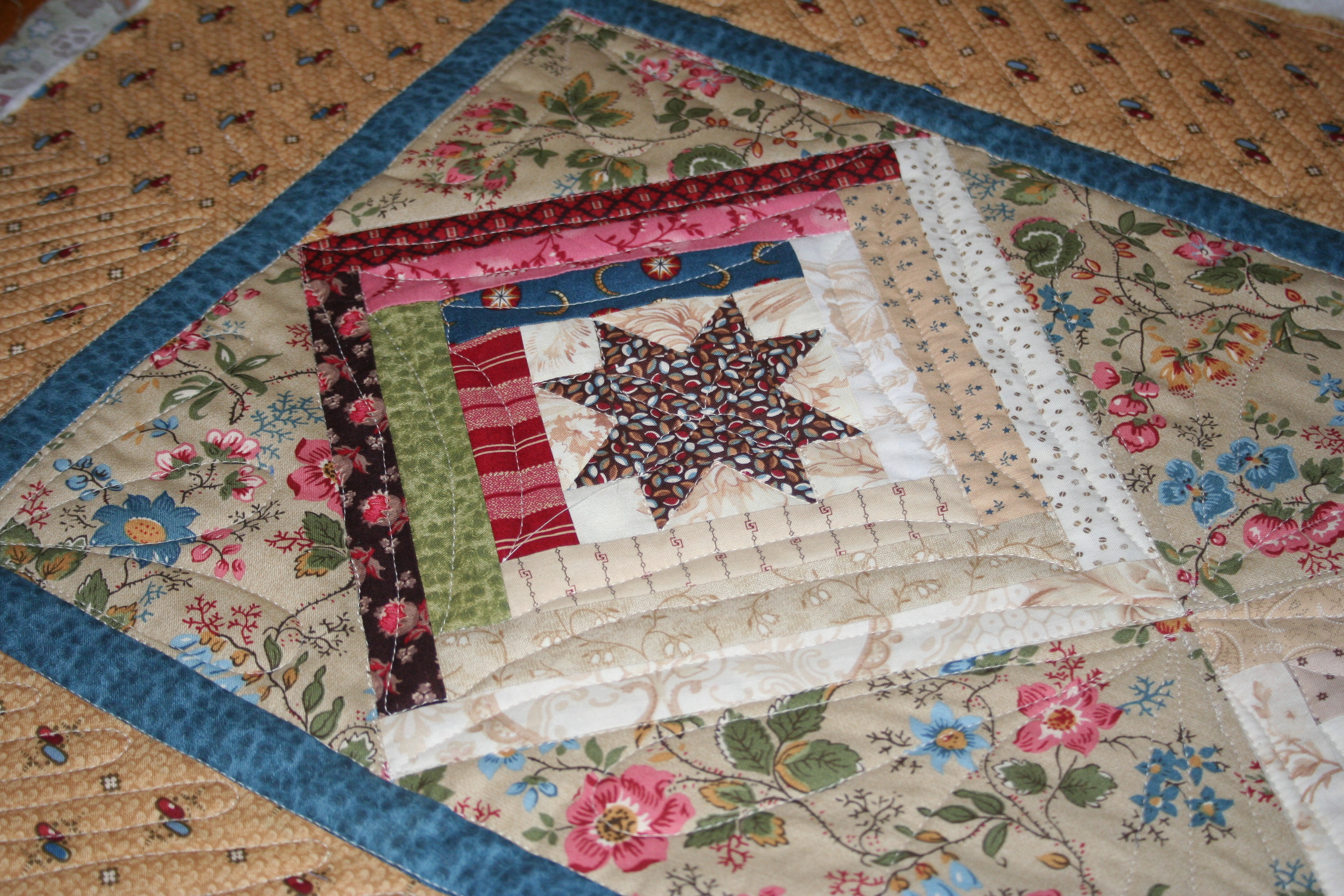 It began with a table runner made for her Bread and Butter Quilting Circle. It has rounded edges in the log cabin, stars in the centers, flowers in the bordering triangles, and diagonal ladders in the outside border.