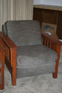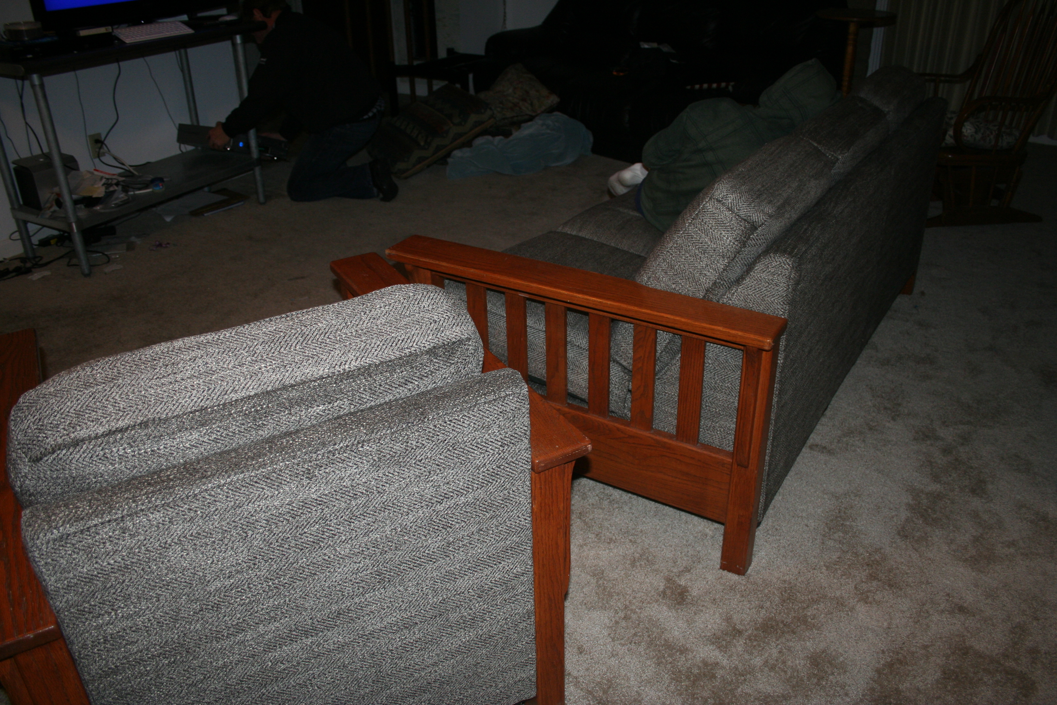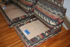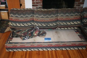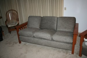 I received a couch and chair. I know wish I had photos of the before complete with arms and cushions. But we will have to settle for what we have.
