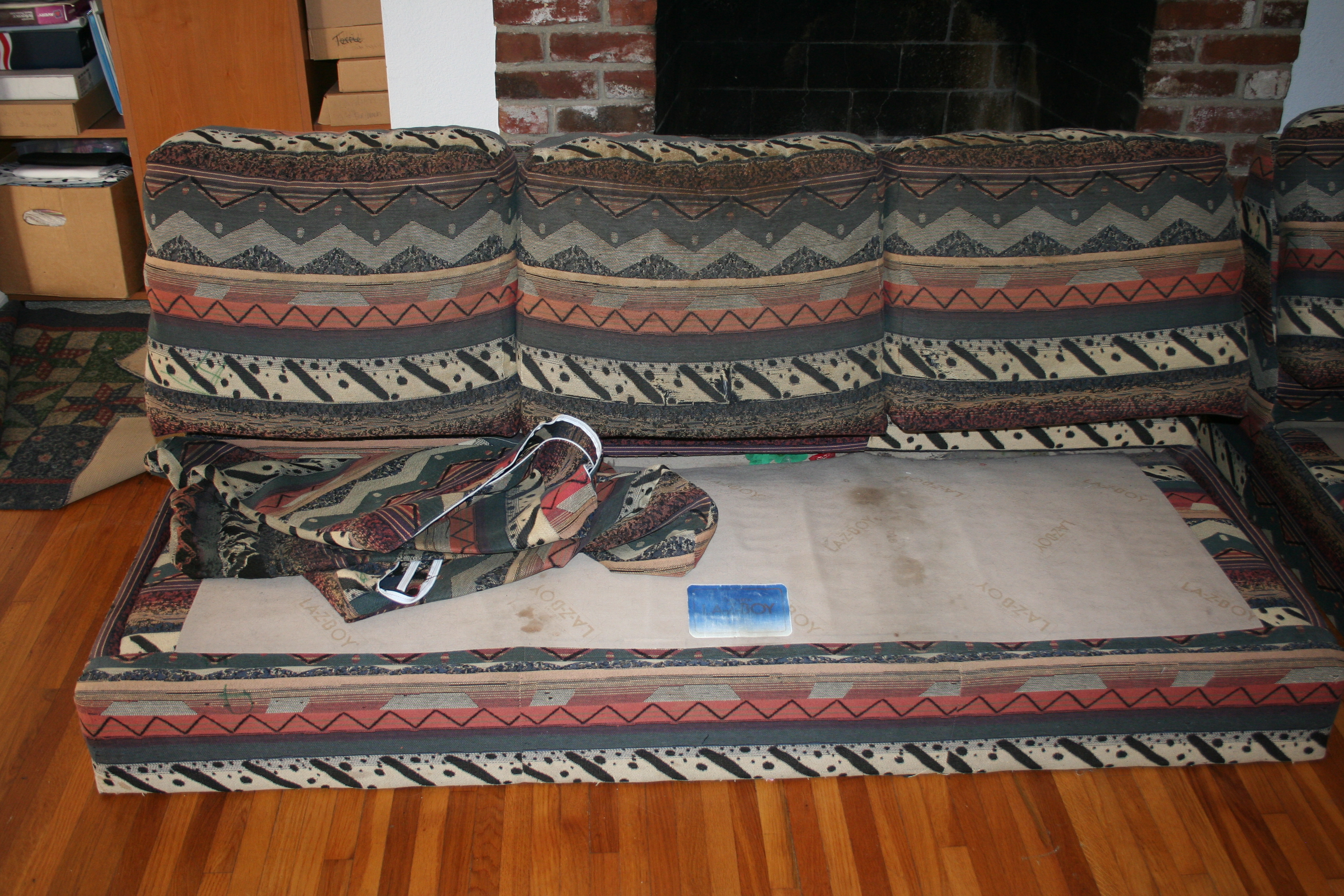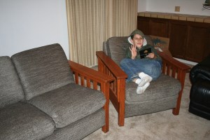 While I didn’t take the time to take photos all the in between stuff from: the fabric and my self all over the kitchen floor to cut out the pattern. And the struggles of sewing it all together. My sewing machine didn’t like the fabric and I had the baby it through the whole project. Or of the day spent putting it all back together, stuffing the memory foam into the cushion covers, contorting the body to staple the cover secure and the final part of putting the arms back on. I did get pictures of the final product.
