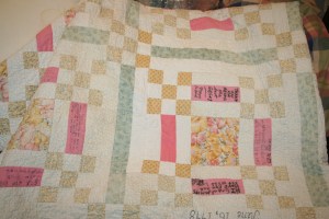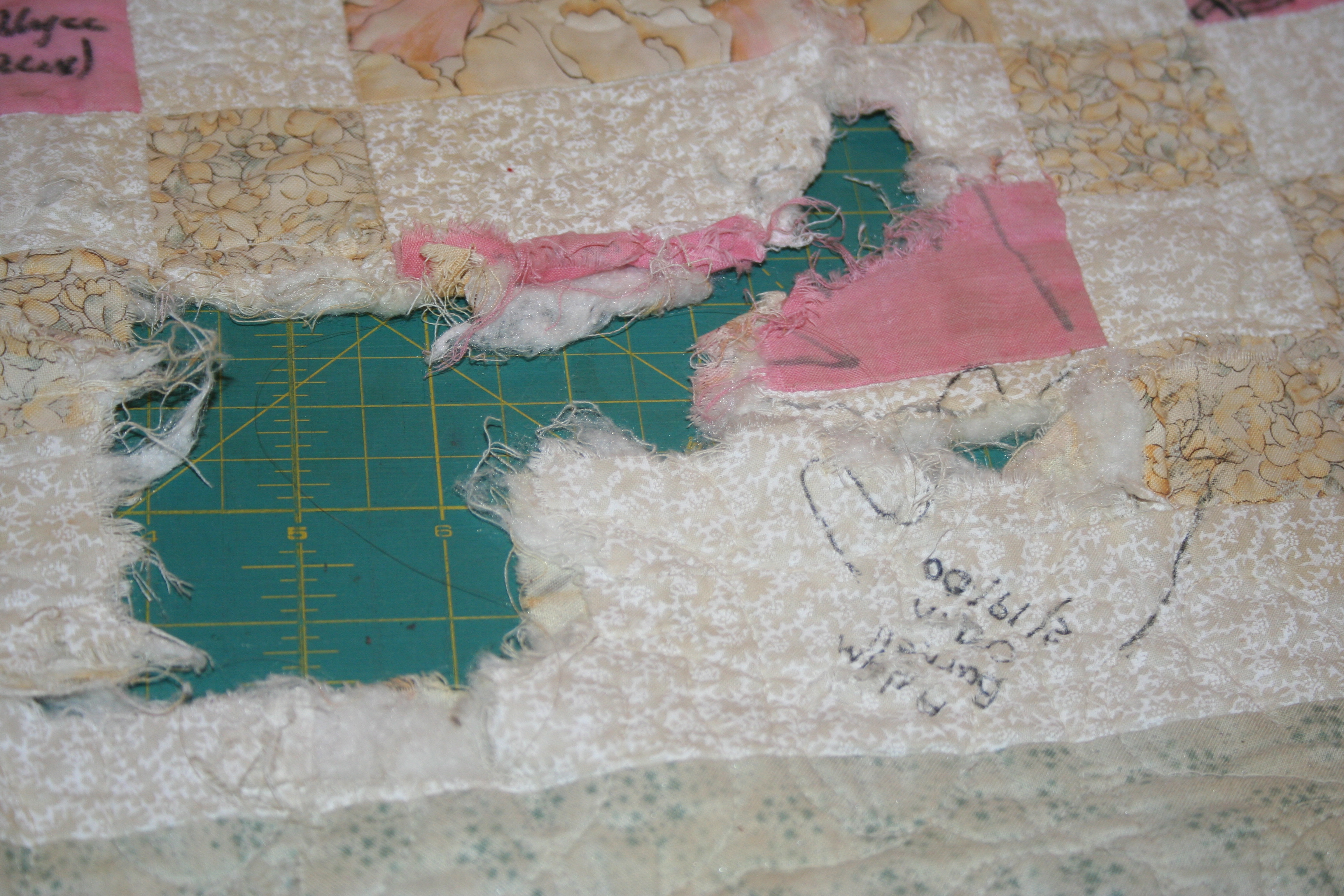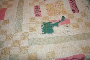 A couple years ago, Grandma had a dog that got a hold of the quilt and damaged it.