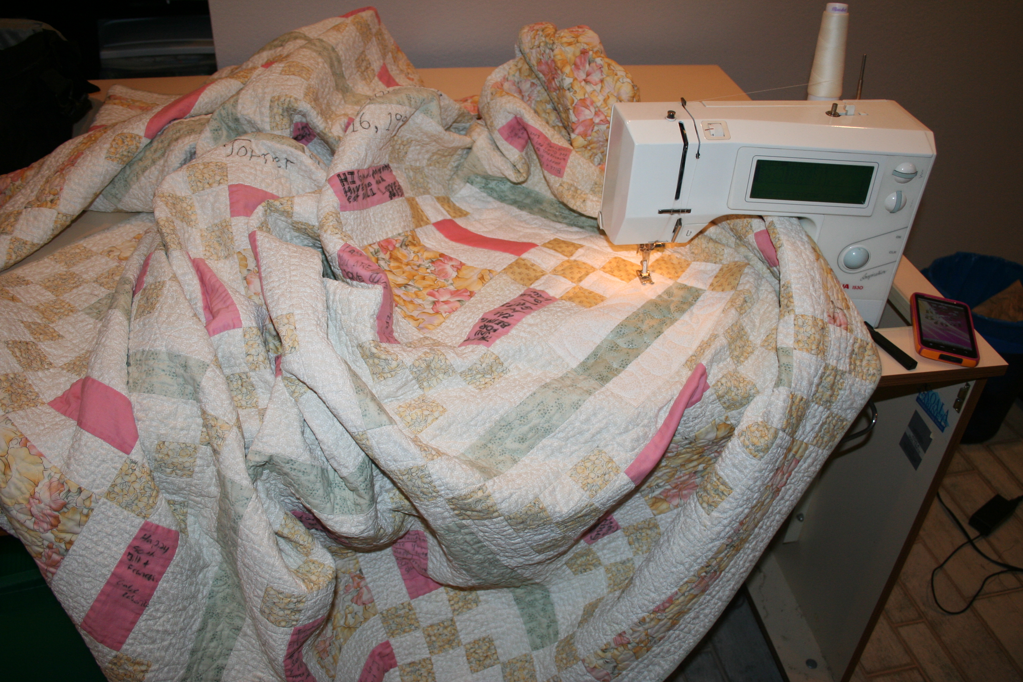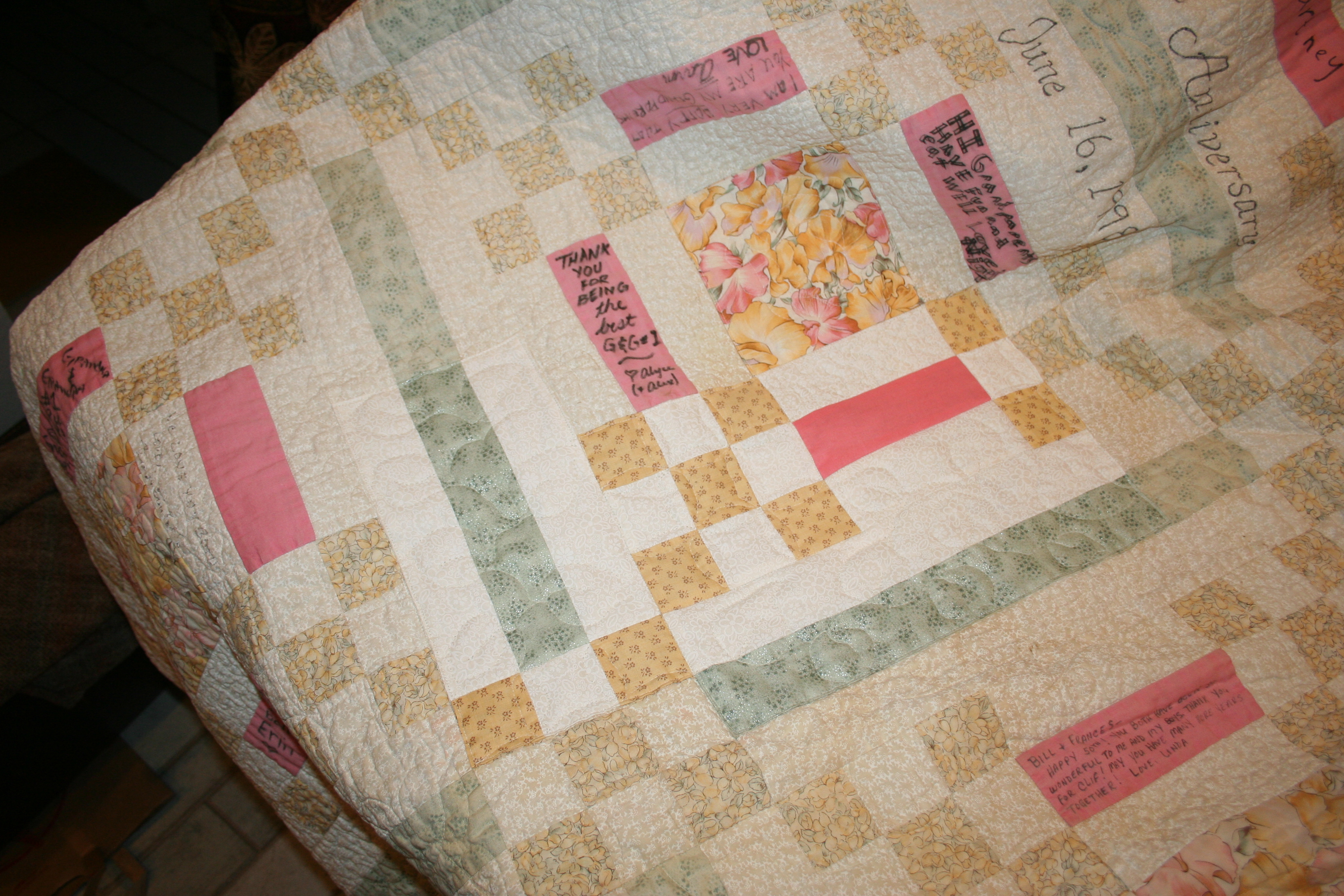 I made a quilt for my Grandma and Grandpa #1 for their 50th wedding anniversary in 1998. While it is special because I made it for them, what adds to that, is the signature of every one in the family that is on it. Before the gift was given we had all the family members at time sign the quilt. Since then, Grandma has been faithful to bring it to every wedding and family event when the new baby was announced for the new members to sign the quilt. It is a record of us all.
