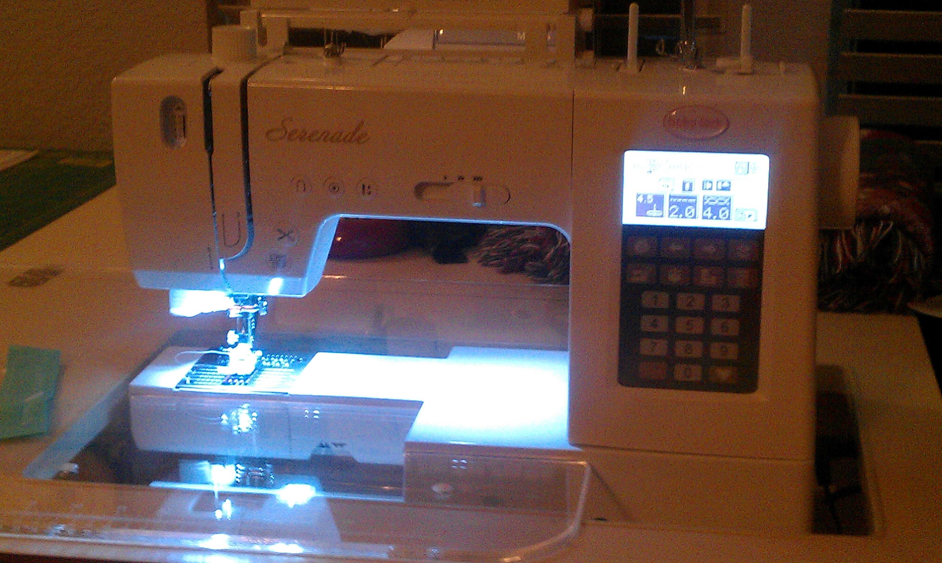 So when I went to pick her up from the sewing machine doctor, I looked around and found what I thought would be a good replacement, the Serenade by Baby lock. I got some information and left and kept thinking about the new one. The fancy features of duel feed and sewing with the push of a button. A sensor that will warn you when you are almost out of a bobbin and being able to wind the new one while you are still sewing. These were just a few of the selling points. It was also less than what I was expecting to pay for a new one.