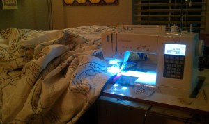 But there is no time to play, work must be completed. I had some binding to do for a quilt that needs to be on it’s way to San Francisco tomorrow. The Serenade sews like a dream. There are a few things, like with all new toys, that I will have to get used to, but all in all. I am happy she is home.