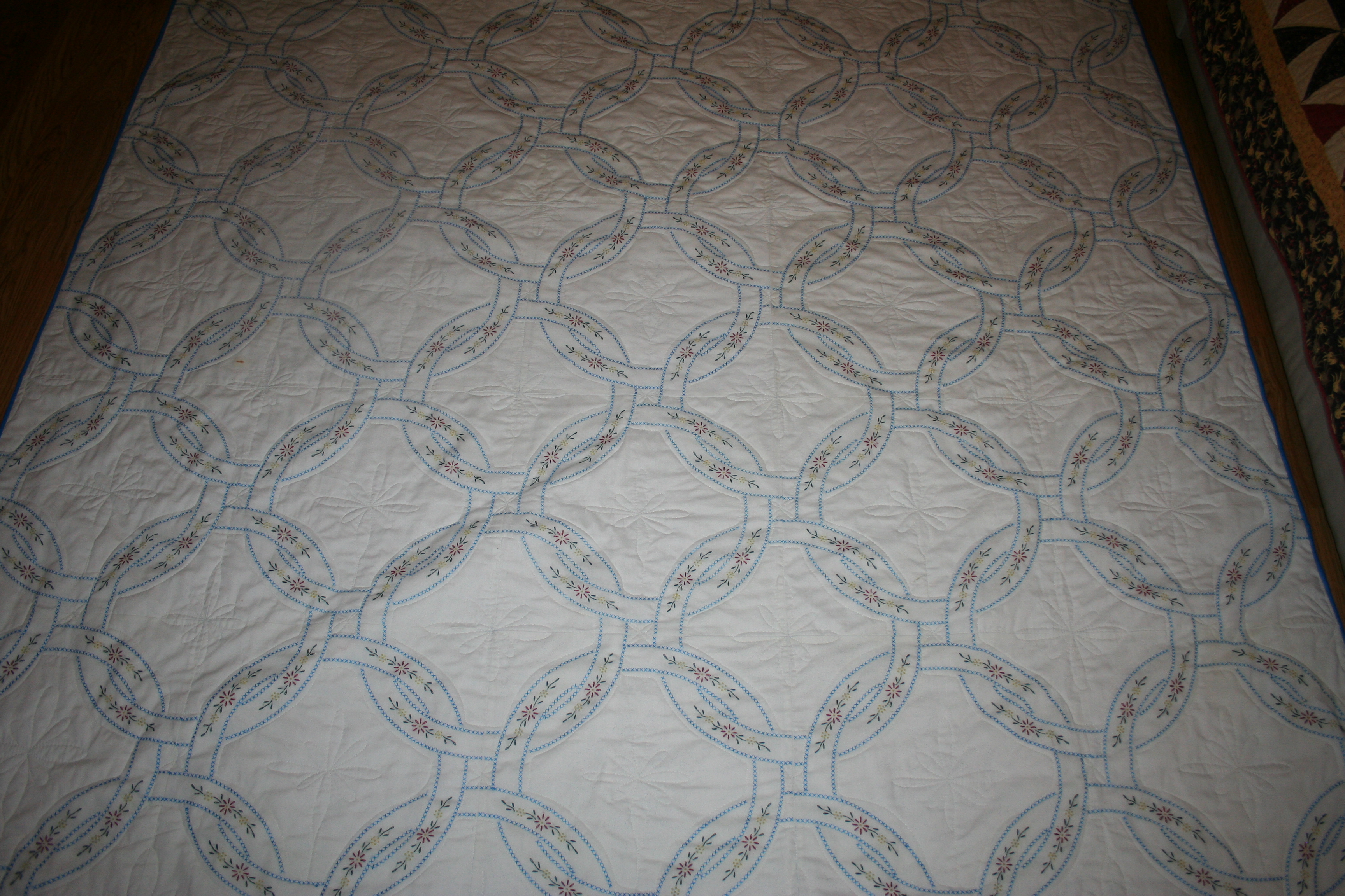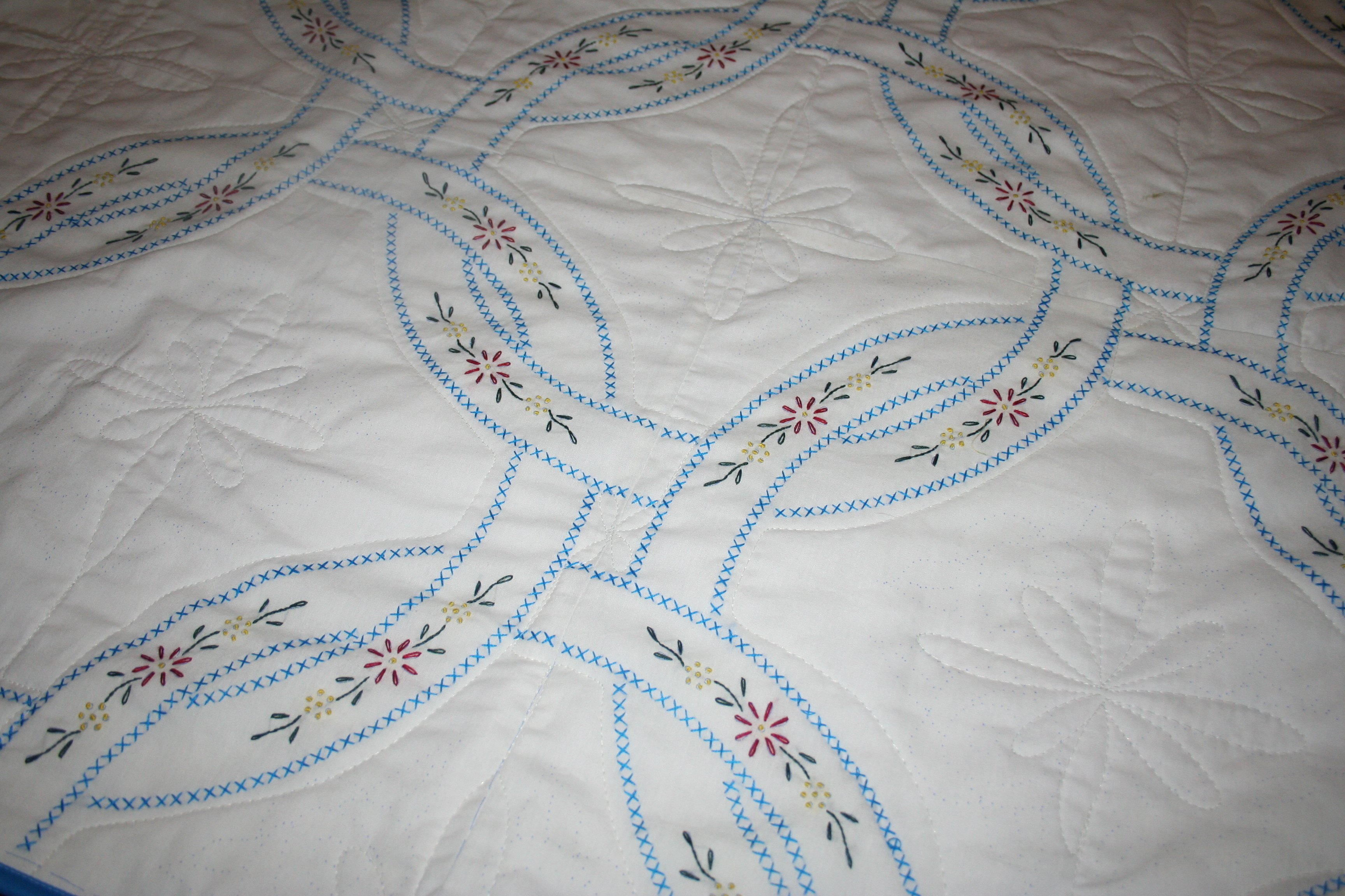 The quilting is very simple, outlining with in the rings and an 8 petal flower to mimic the embroidered flowers.