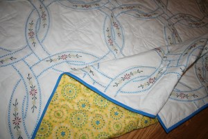 My customer picked out a cheery yellow back and a nice blue to bind. It brings out the embroidered rings perfectly.