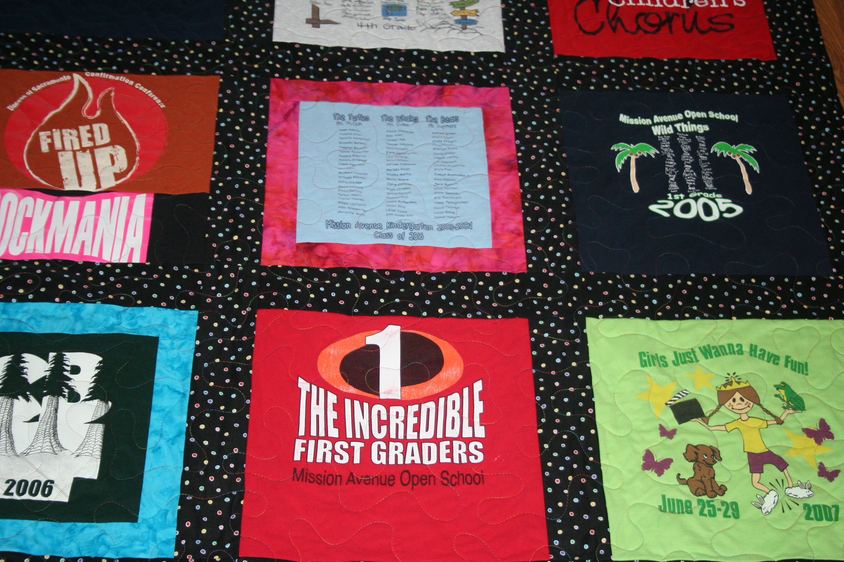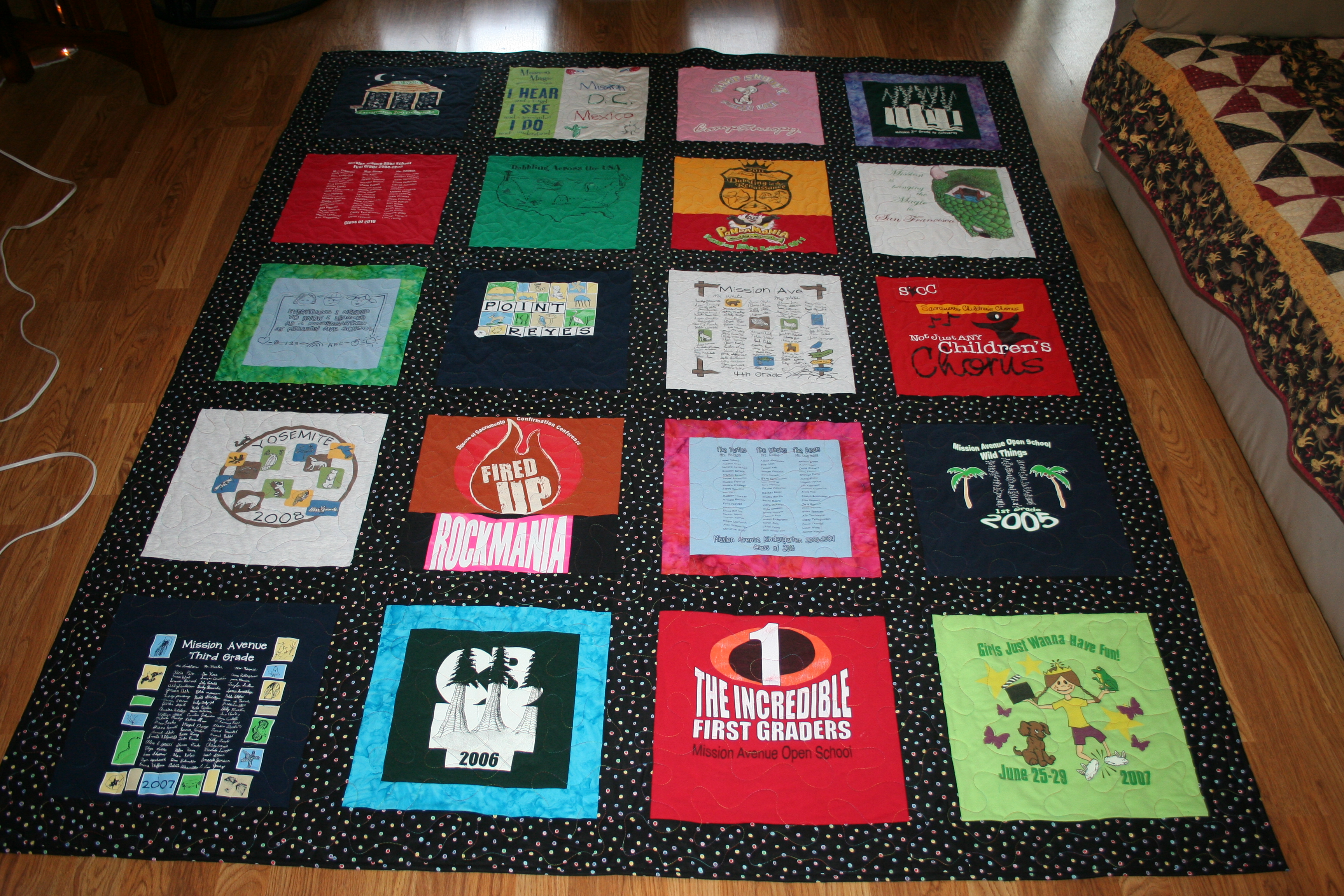 A few years ago I was commissioned by my cousin to make a quilt for her daughter with the T-shirts she collected throughout grade school. Last year my cousin’s friend contacted me to make a quilt with her daughter’s shirts. The 2 girls went to school together and several shirts were familiar but both quilts were unique. I completed the second quilt this month and the Mom was very happy. 🙂