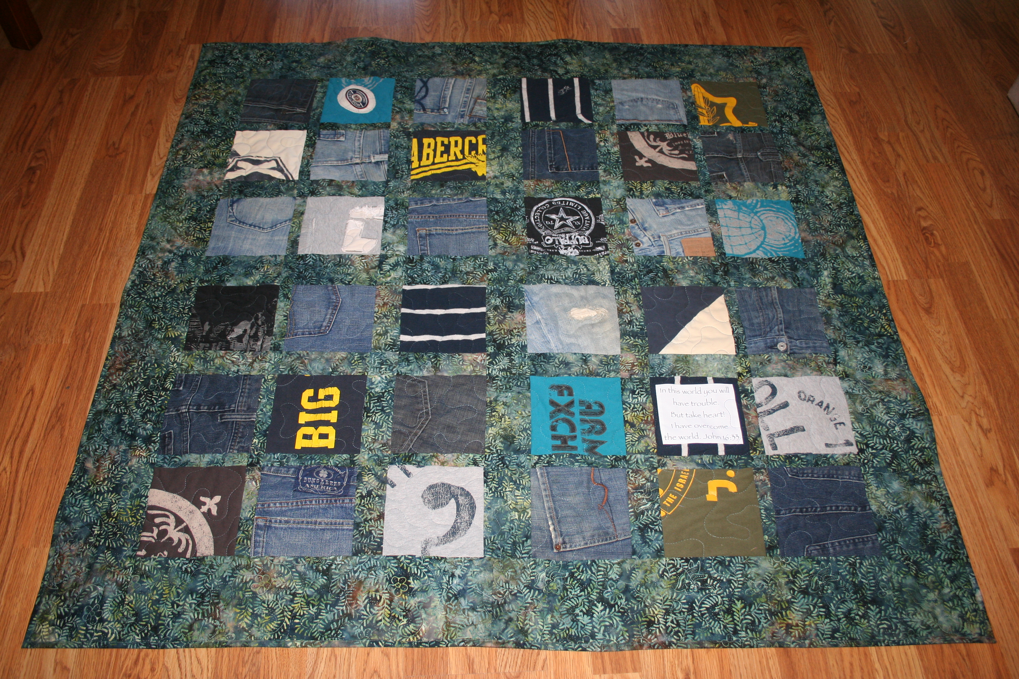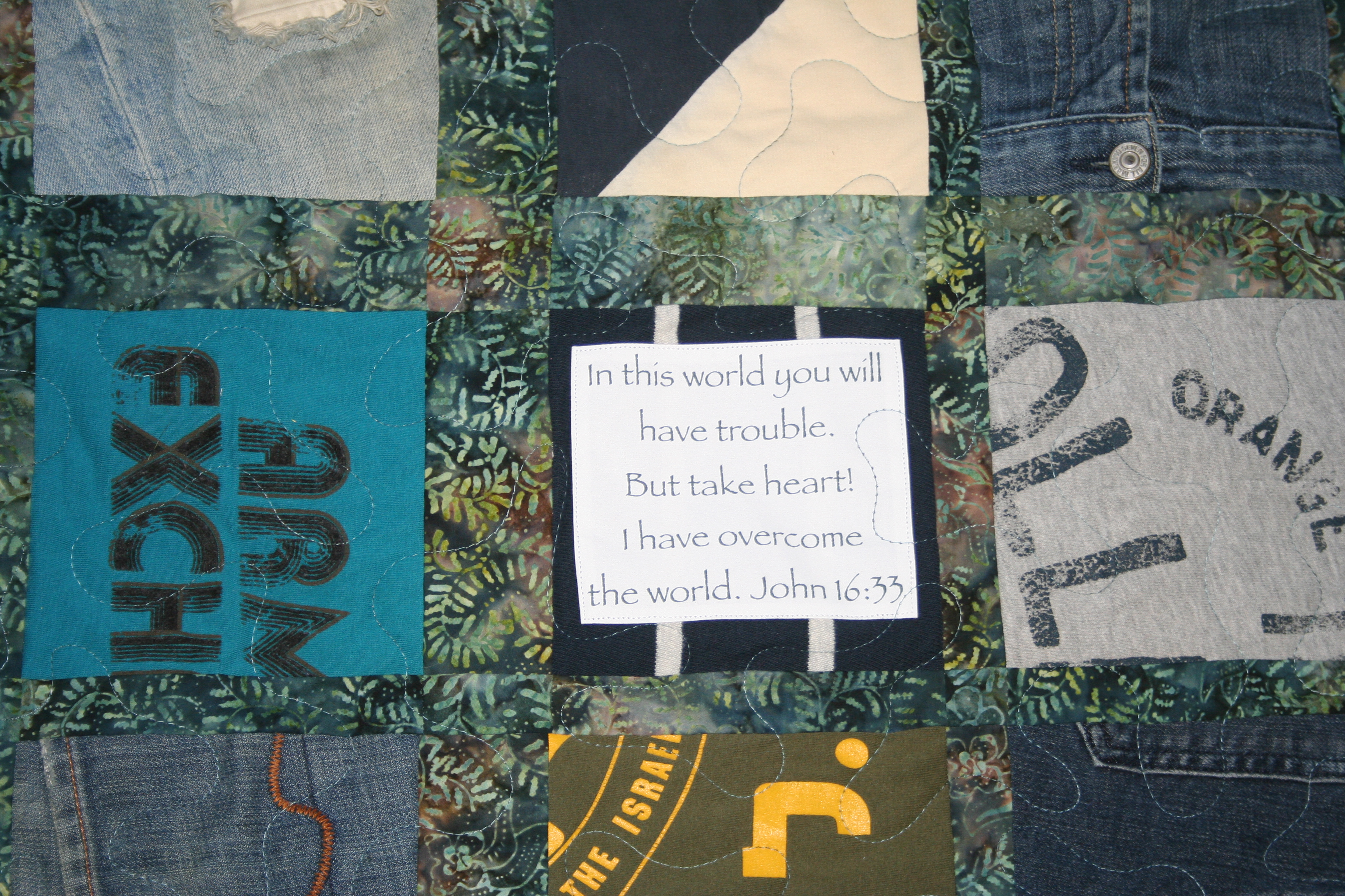Each quilt was to have a quote, the first one had “In this world you will have trouble, but take heart! I have overcome the world.” John 16:33.