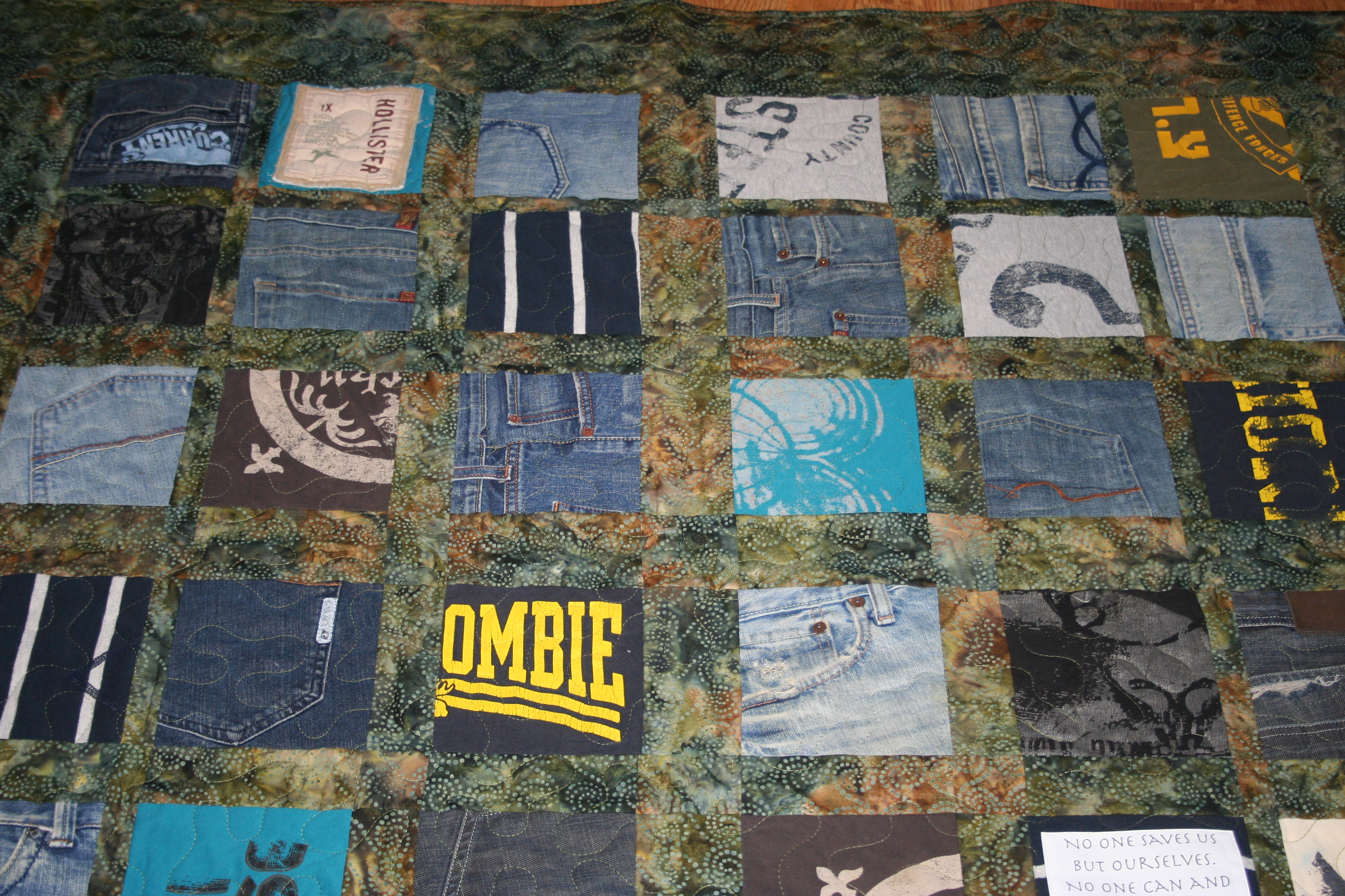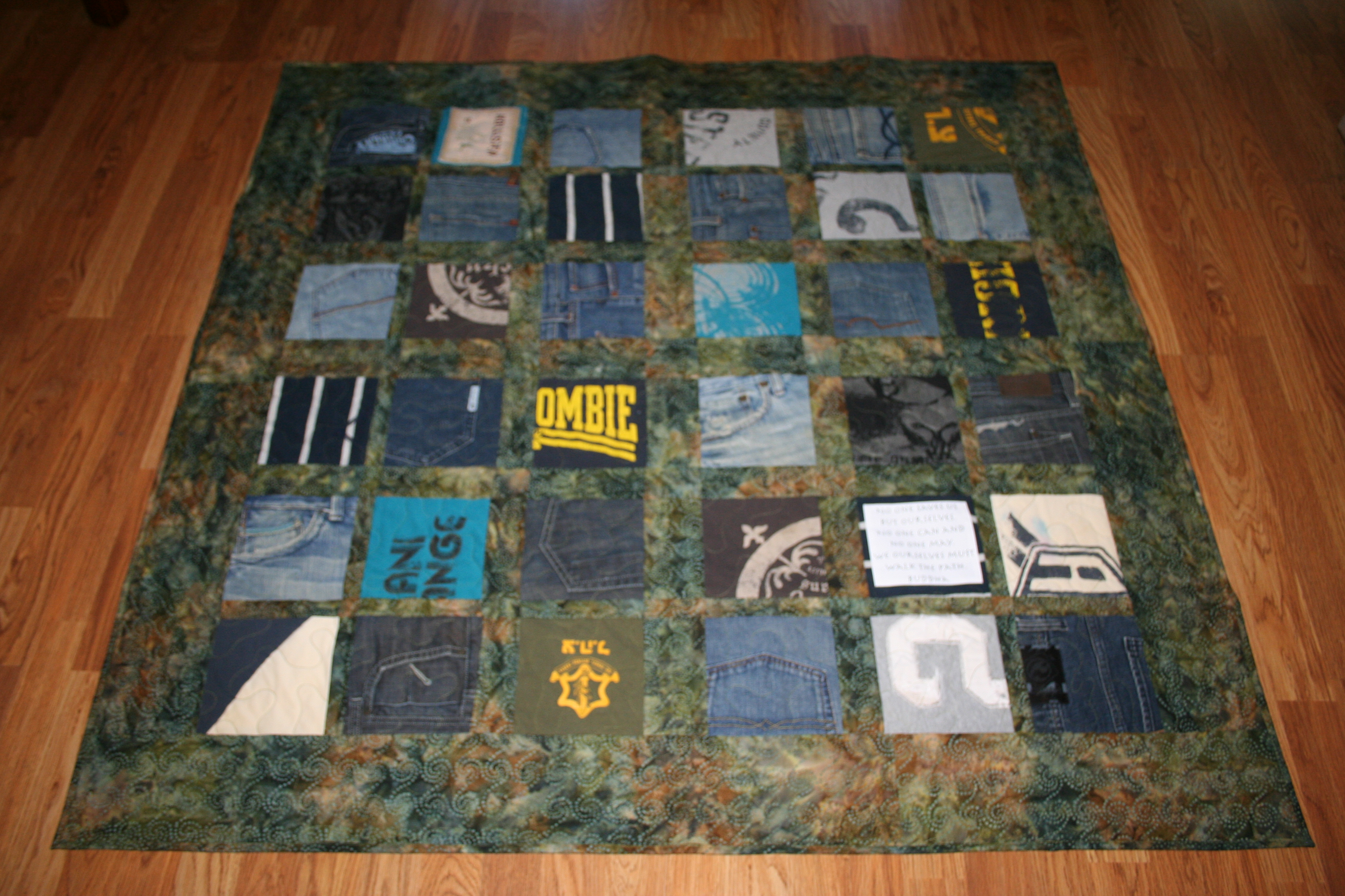 The squares were cut from jeans and shirts from the loved one that had passed away.