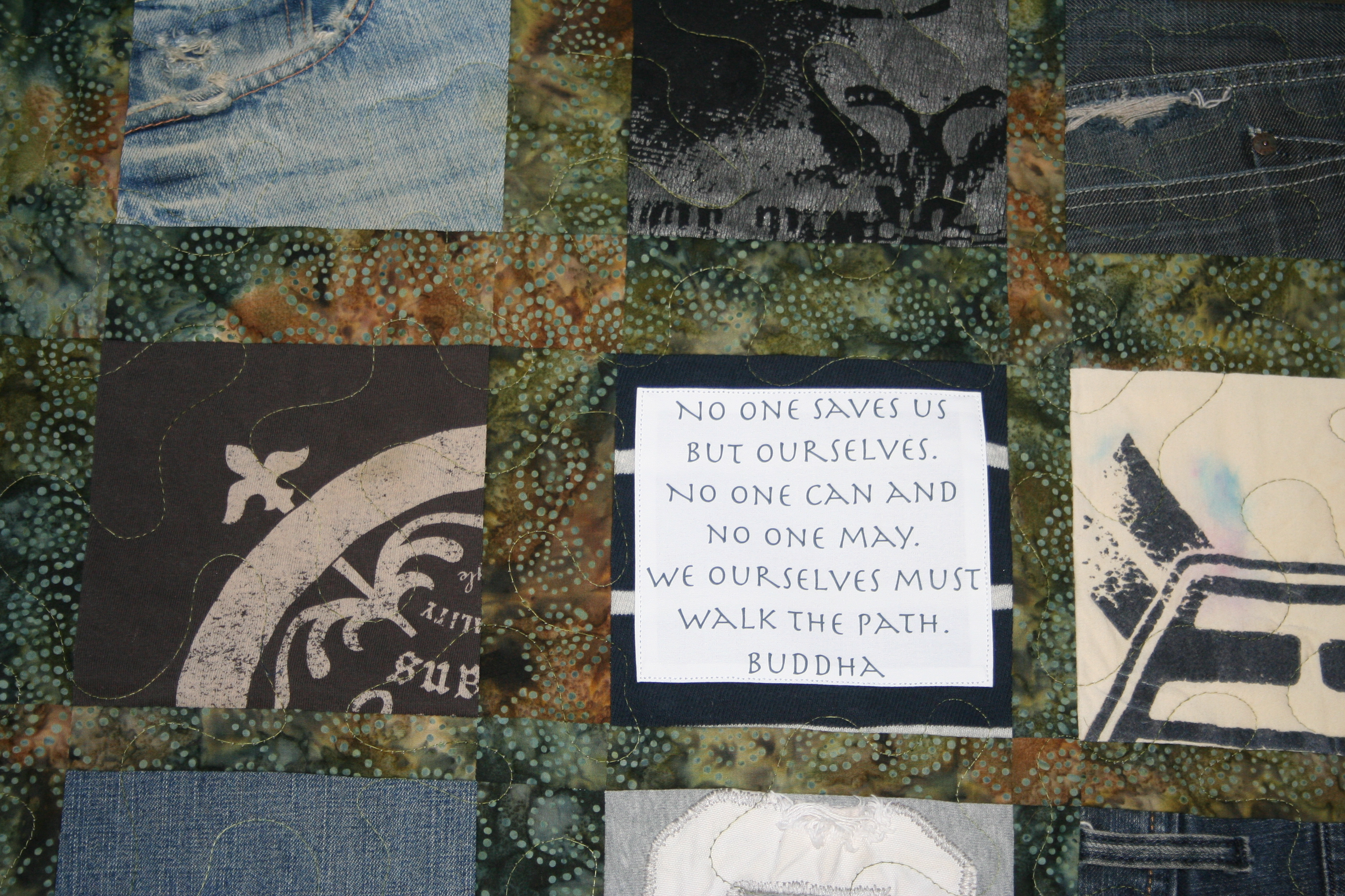 This quilt has the following quote: No one saves us but ourselves. No one can and no one may. We ourselves must walk the path. Buddha
