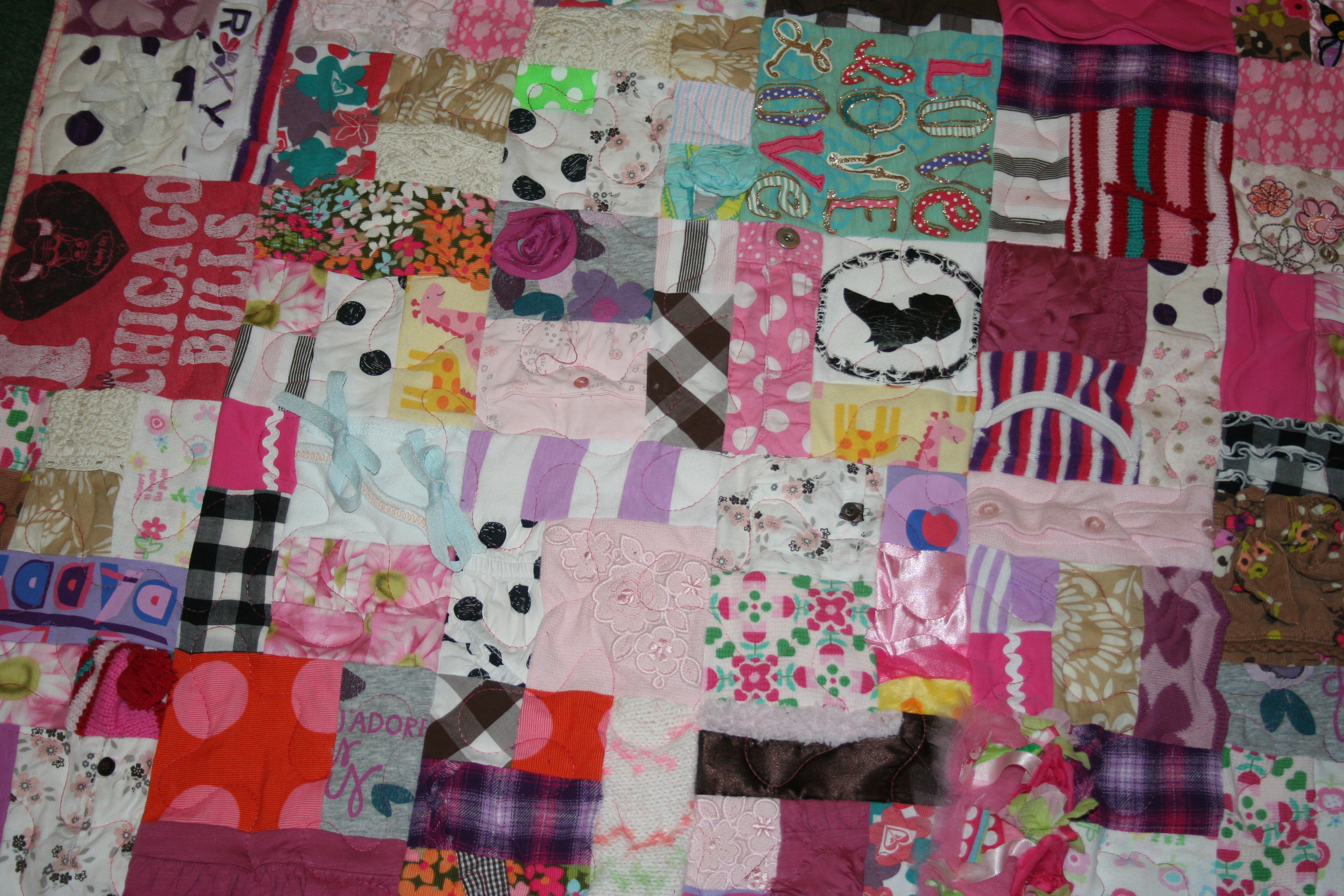The last quilt that I finished this month was made of those precious baby clothes that a mother can’t part with.