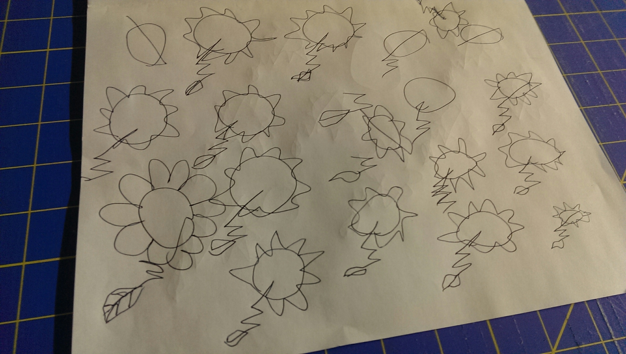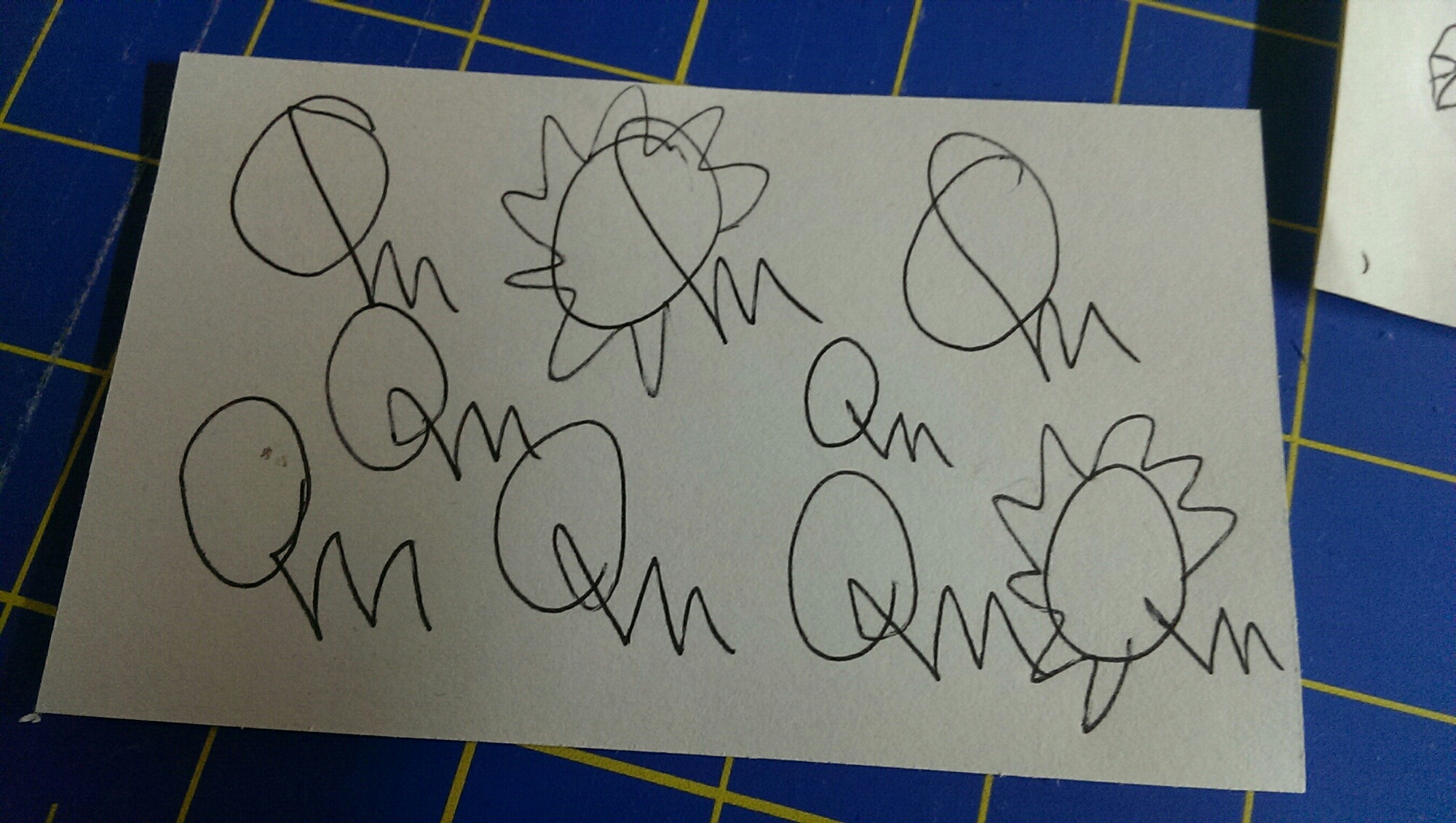 At first I thought about a sunflower. That would represent the business name of Sunflower Designs, but I wasn’t completely sold. Then today while driving, I thought of doing a Q and an M connected for Quilt’m. Ok…I liked that idea…now to think some more and draw it out. I was finishing up a quilt this evening and wanted to brand it, there is no time like the present. I pulled out some scratch papr and began doodling.