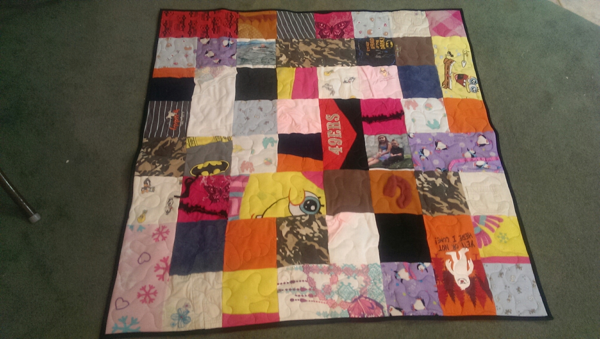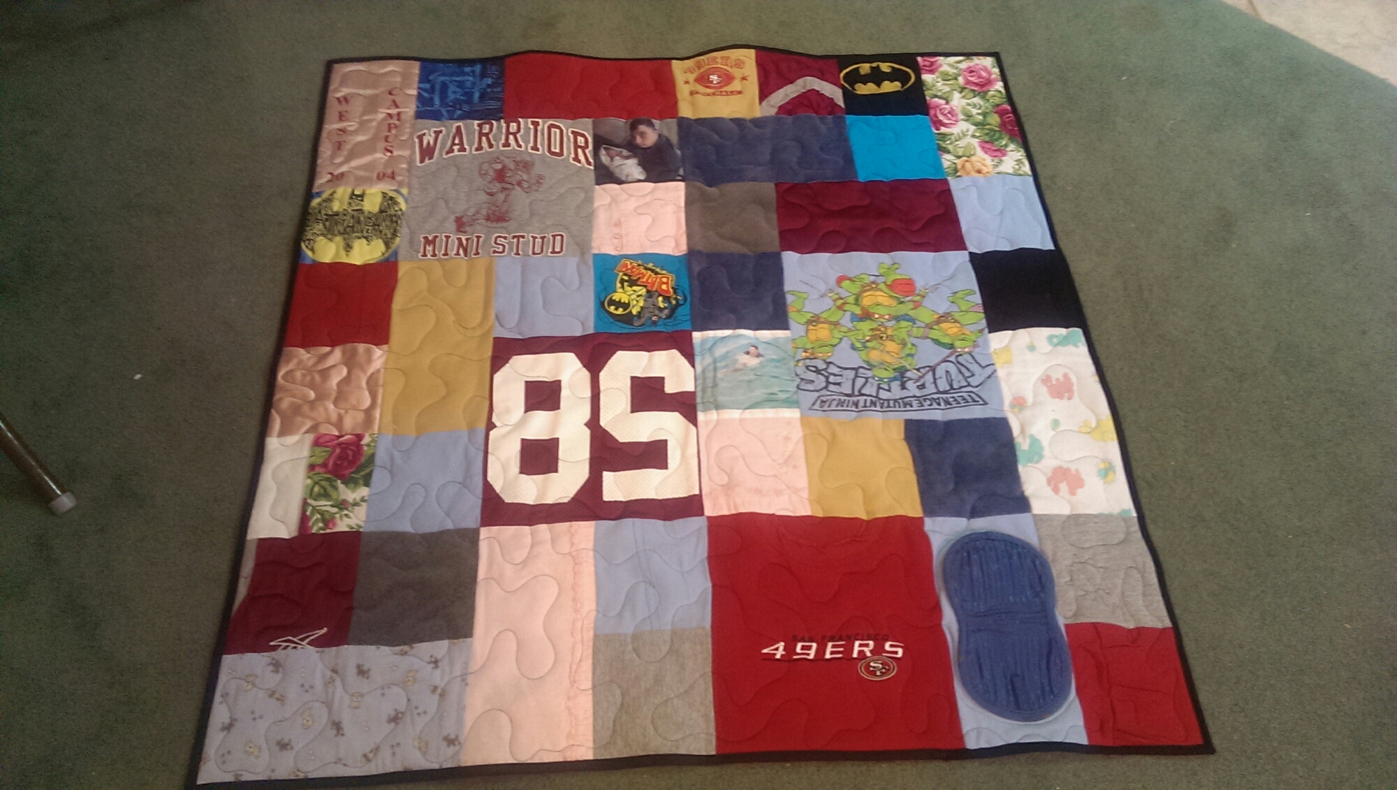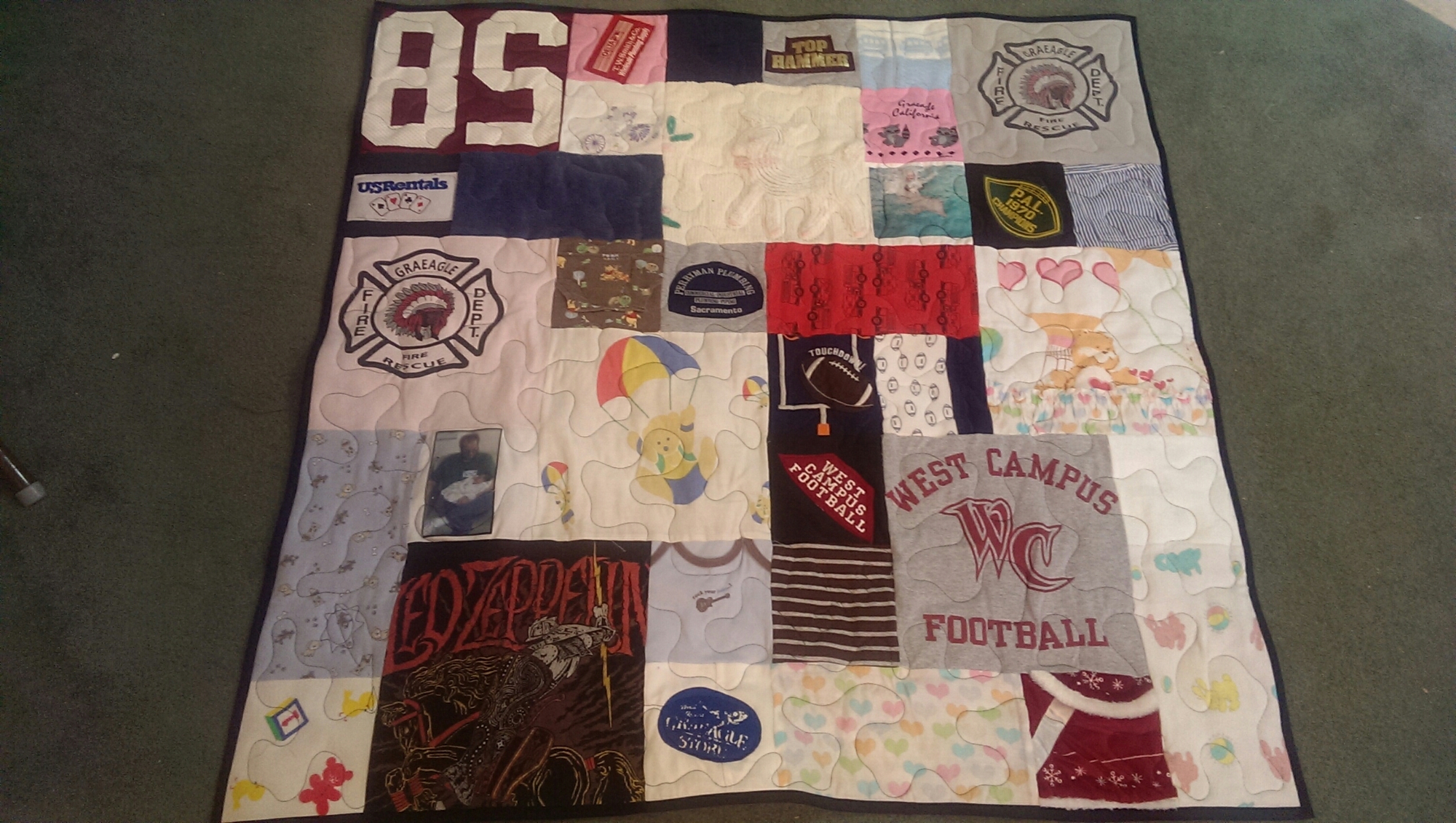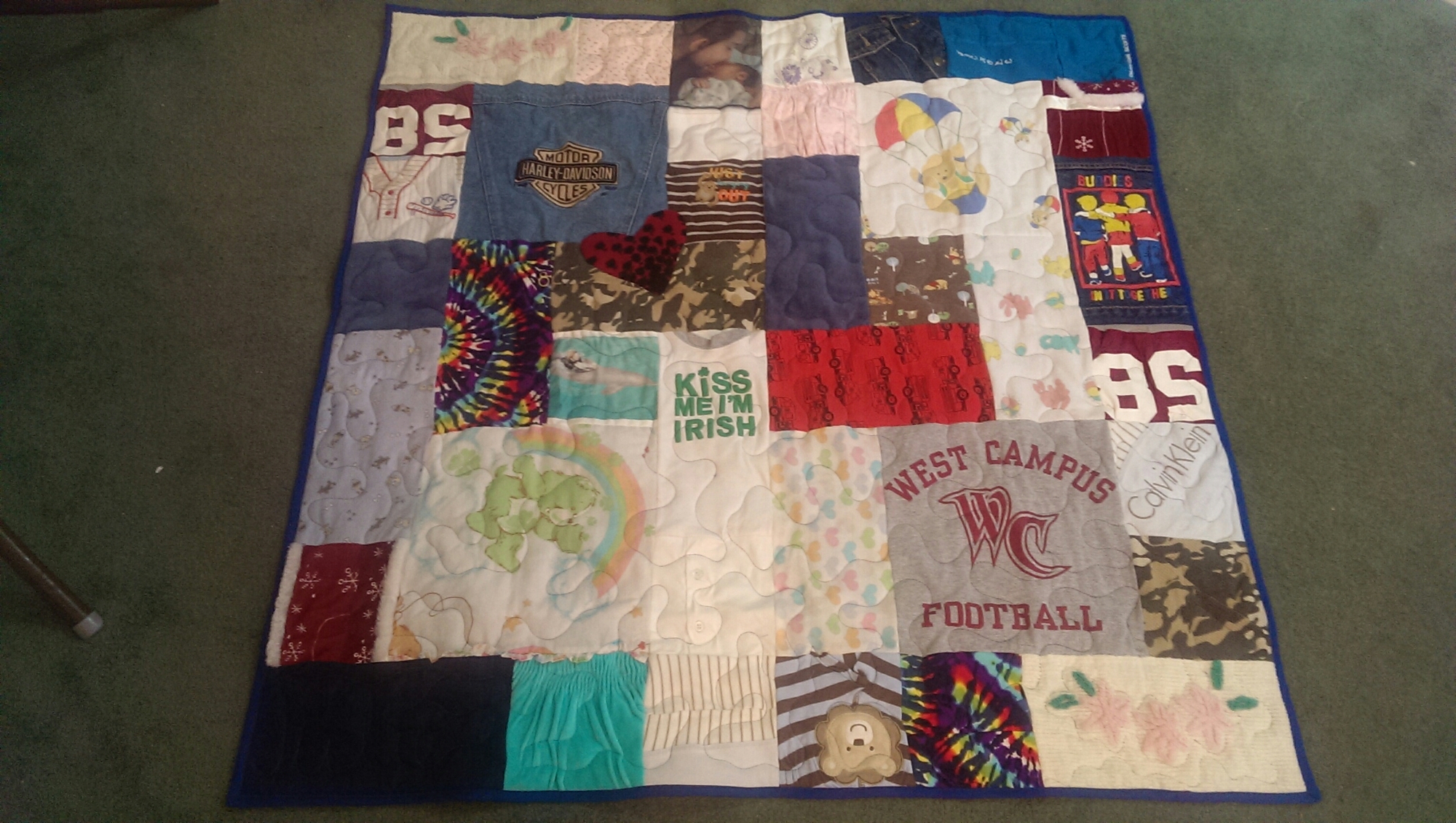 What started out as multiple clothing stuffed bags, a few instructions, emailed photos to be printed on paper and a deposit, finished in 6 48″ square memory quilts. And all done in time for Christmas, with a week to spare.