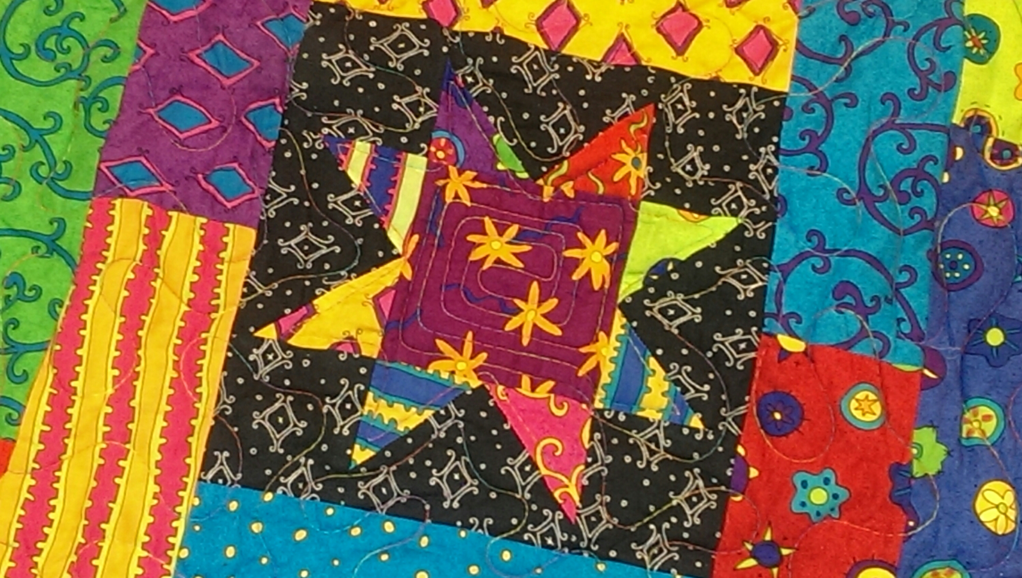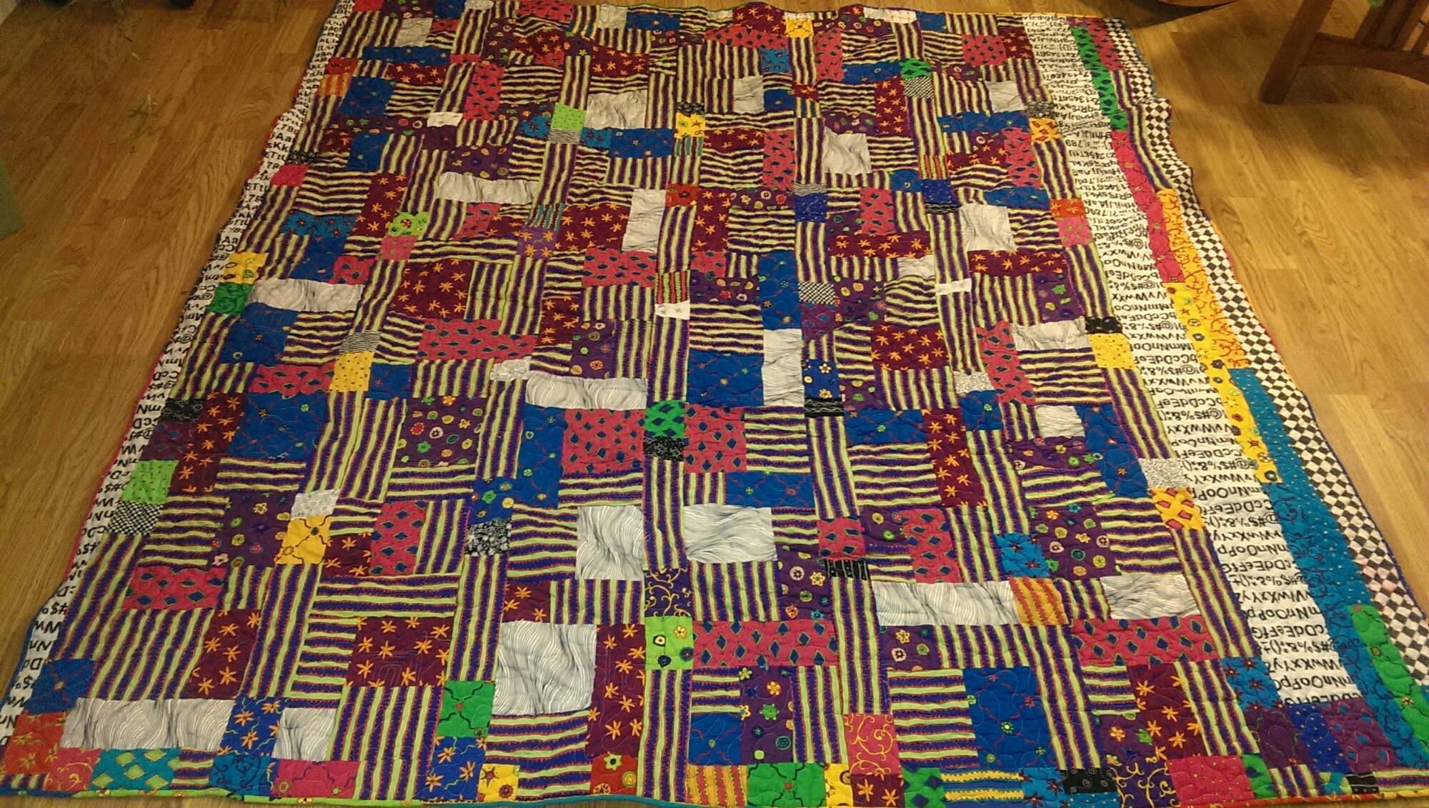 I love the bright colors. I got the fabric when I worked at Material Girls, a local quilt shop. It was my first job at 16 years old. The quilt was started around that time. I even pieced the back (as I had enough fabric to do so and was over ambitious)
