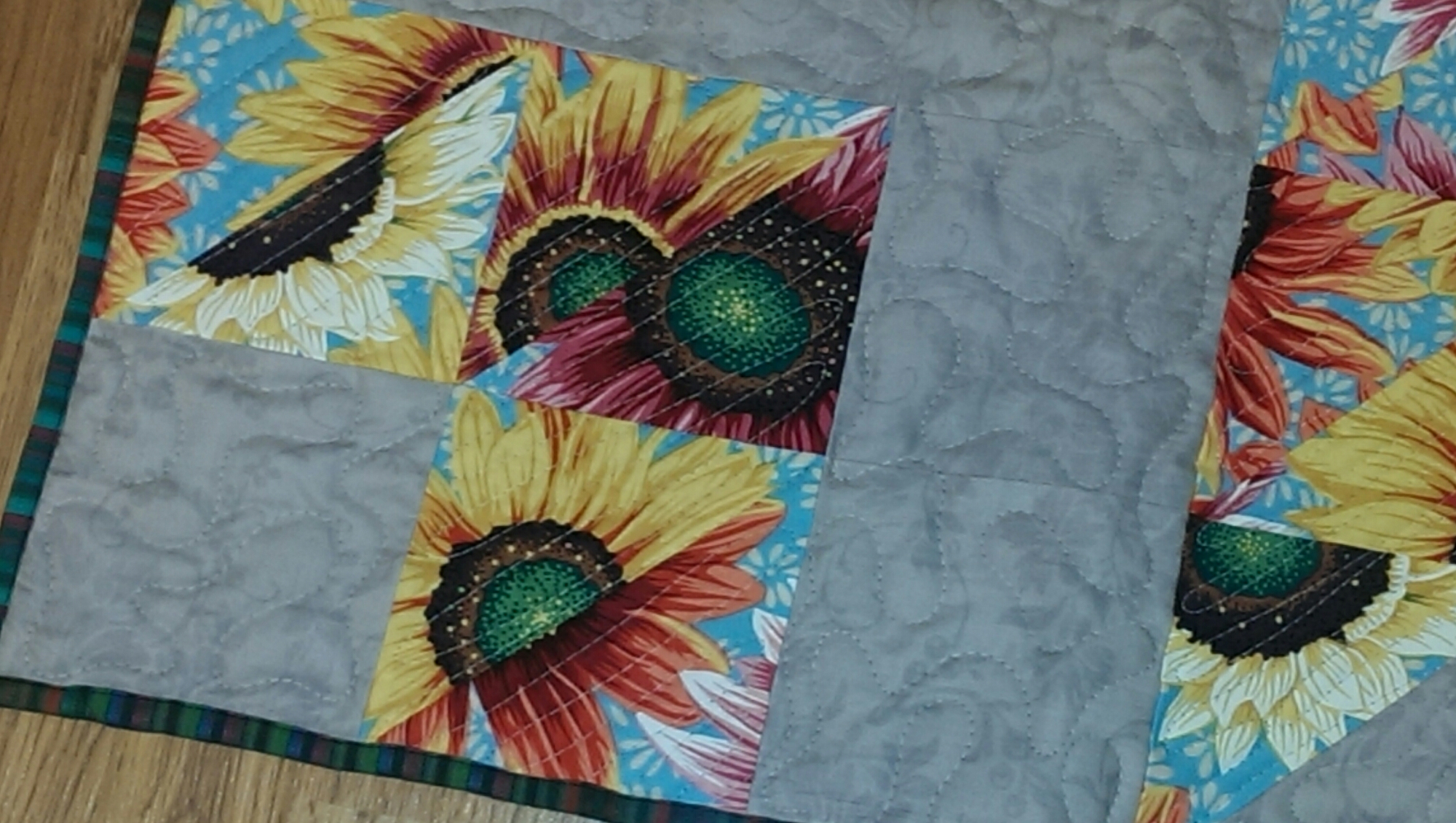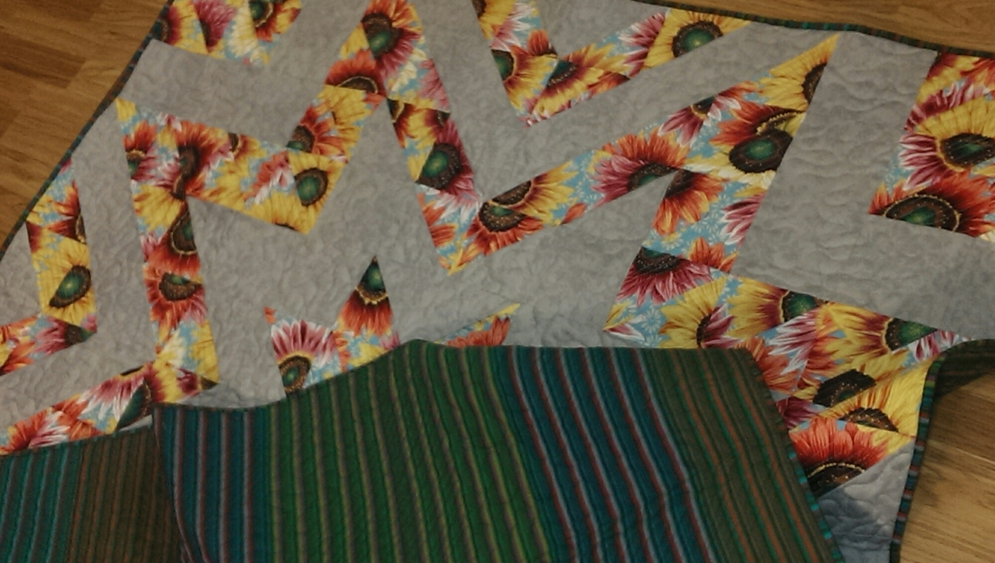 I am thinking of putting it up for sale. I thought I had bought enough of the sunflower fabric for the back, but when I pulled it out, I was short. I went on a hunt through my stash and found this perfect stripe.