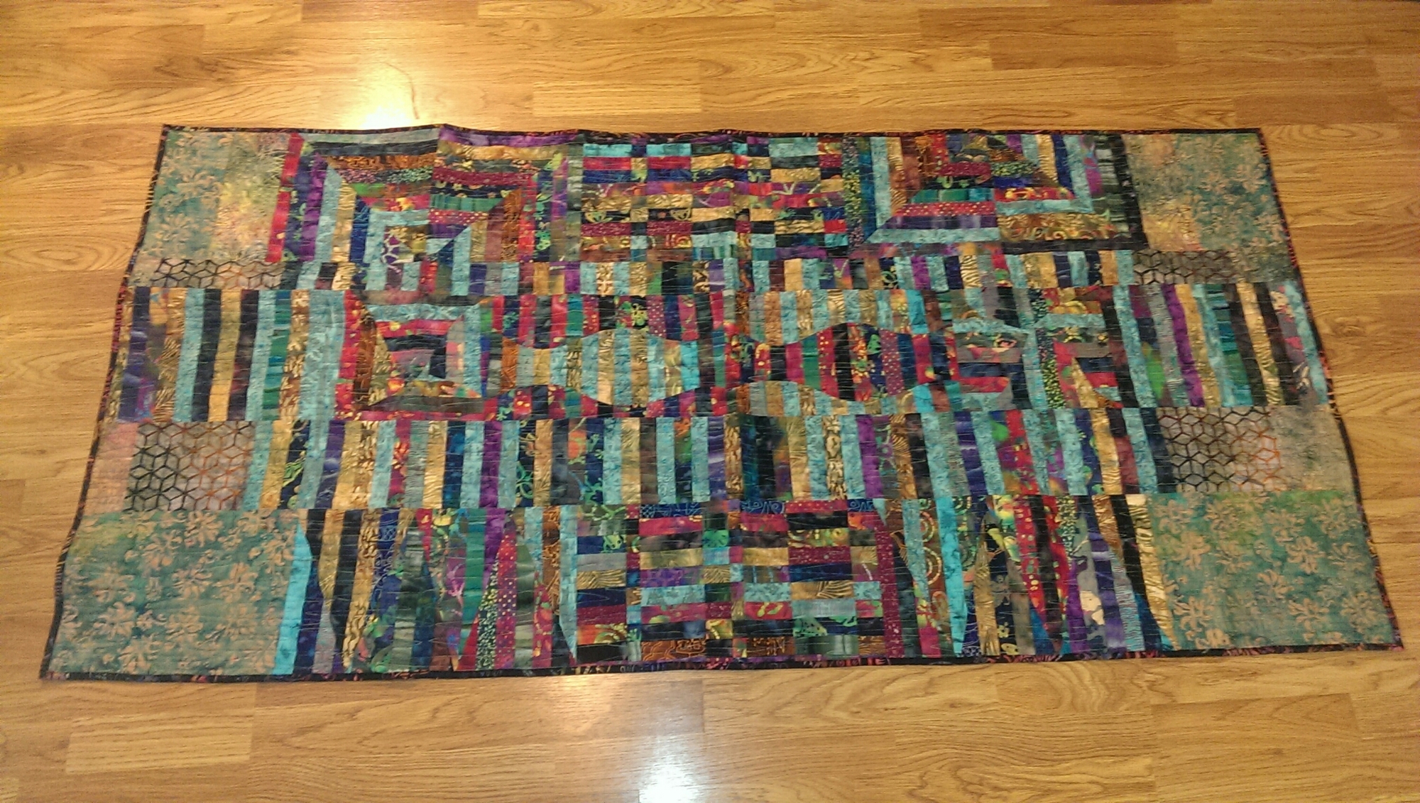 This complementary quilt is odd shaped, long and not wide but not narrow. So to be hung on a wall or table topper, but not a lap or bed quilt. It was originally to be the back of the unfinished quilt…but was told that it was too cool to be the back…so a top it became.