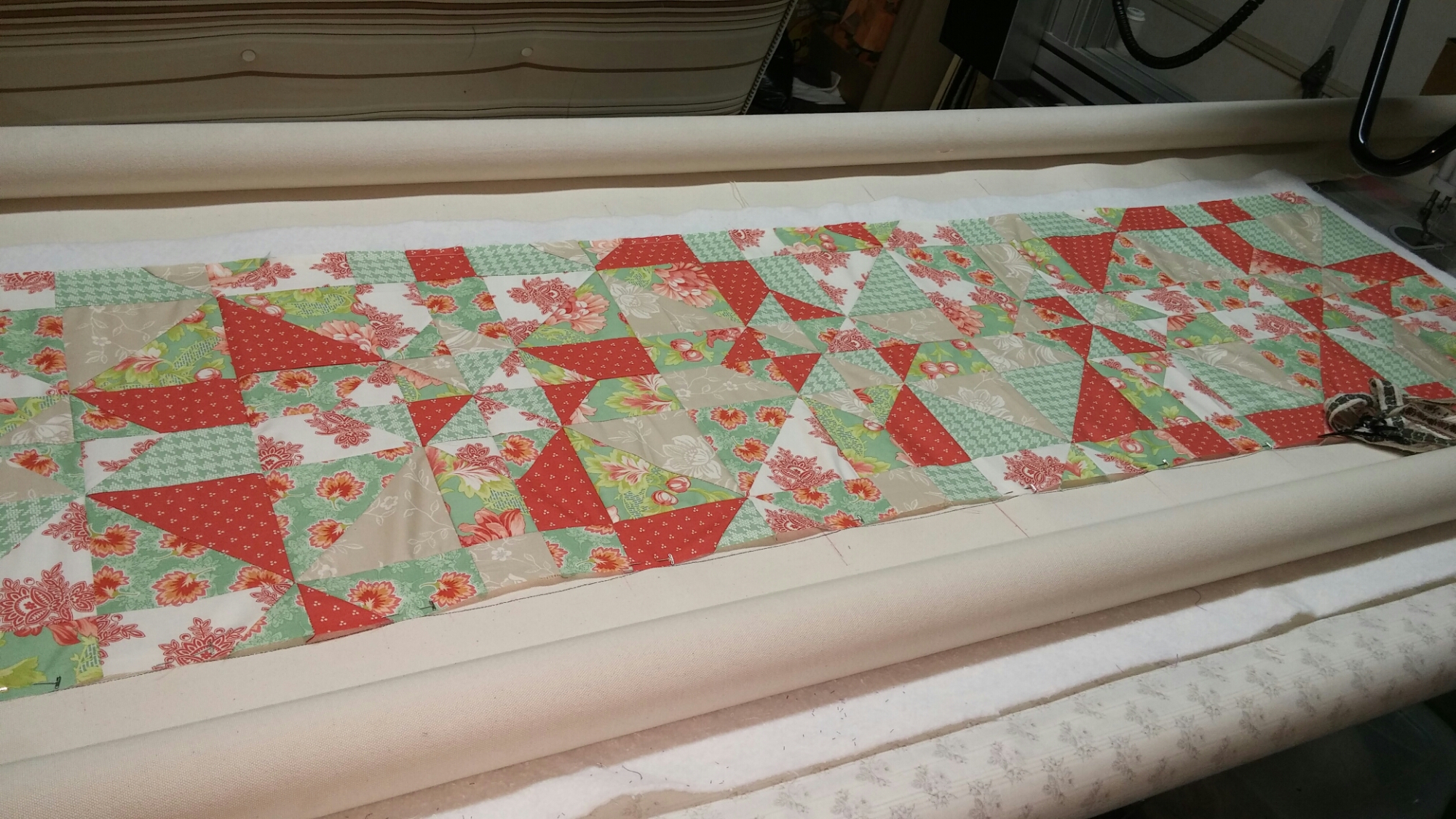 It’s on the machine ready to be quilted. Then took my dogs for a walk in the beautiful spring day. I did get in a little work and finished up the top of this quilt and prepped the backing.